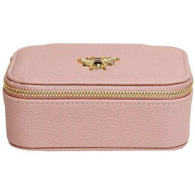 This women's mini travel jewellery box has been made from vegan faux leather and faux suede interior, featured in a pink colour and is from the brand Alice Wheeler London. It measures 8cm(height) x 13cm(width) x 5cm(depth). All the jewellery boxes come complete with alice wheeler packaging. The Alice Wheeler London Mini Travel Jewellery Box - Pink will become an all-time favourite with its great organisation and perfect size to slip into your bag whatever the occasion. Perfect for adding to any bag to keep your jewellery organised in one place whilst doing it in style, whether that’s for when you go to the gym, on a weekend away, or just to store your favourite pieces. The gold-toned zipper closure offers security and luxury. Complete with the signature honeybee logo adorned to the top of this case.
