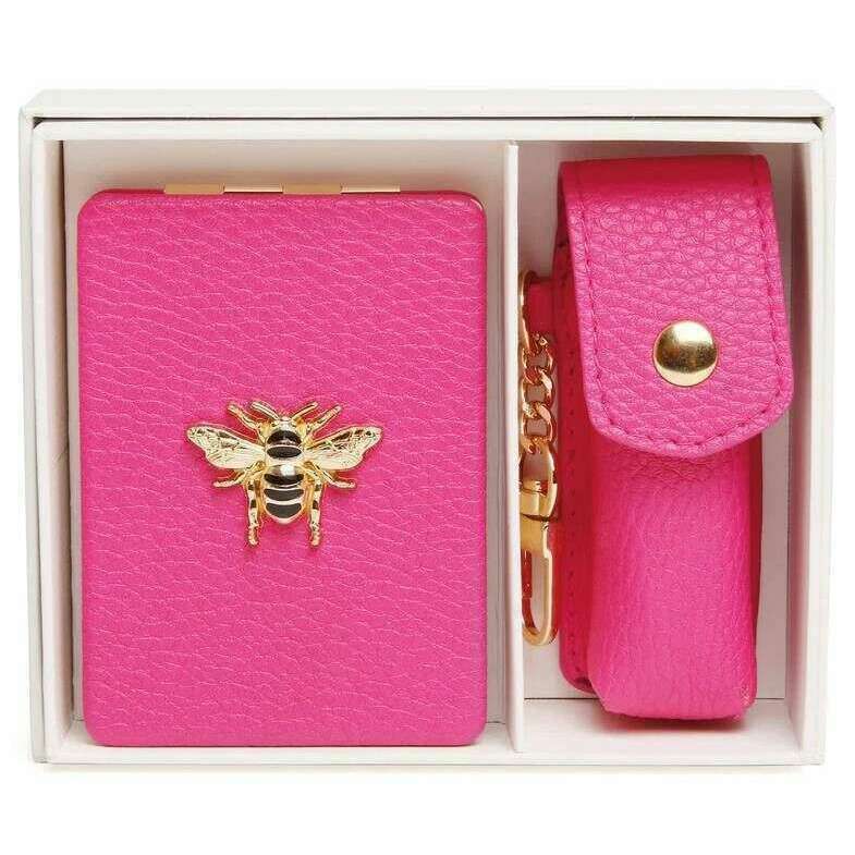 ({IF["This oblong compact mirror and lipstick holder gift set for women is fashioned by the brand Alice Wheeler London in a pink colour and is made from 100% vegan faux leather. It measures mirror - 8.5cm(height) x 6cm(width) lipstick holder - 8.5cm(height) x 3cm(width) x 3cm(depth). All the compacts come complete with alice wheeler packaging. The Alice Wheeler London Oblong Compact Mirror and Lipstick Holder Gift Set - Hot Pink will make a stunning gift to yourself or someone you love. The beautifully iconic bee embellishment is featured on the mirror, and both have matching colours and hardware, making them a stylish matching pair. The mirror is great for everyday touch ups, and the lipstick holder is perfect for protecting your favourite everyday lipstick in style. These will be a perfect addition to your everyday bag, adding convenience."!=""]})