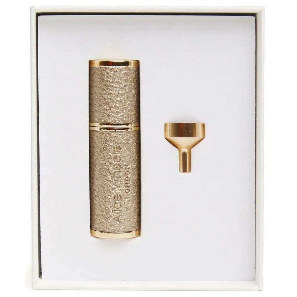 This women's travel atomiser has been made from 100% vegan faux leather, featured in a bronze colour and is from the brand Alice Wheeler London. It measures box - 12.5cm(height) x 10.5cm(width) x 3cm(depth). All the atomisers come complete with alice wheeler packaging. The Alice Wheeler London Travel Atomiser - Bronze is the perfect travel companion to store your favourite fragrance without having to bring the whole bottle with you risking it smashing or getting lost. The gorgeous textured vegan faux leather, gold hardware, and embossed Alice Wheeler branding combined together gives a stunning and luxurious look perfect for carrying your scent in style whilst keeping your accessories fashionable. This atomiser comes with a stunning small gold funnel so you can refill whenever you desire.