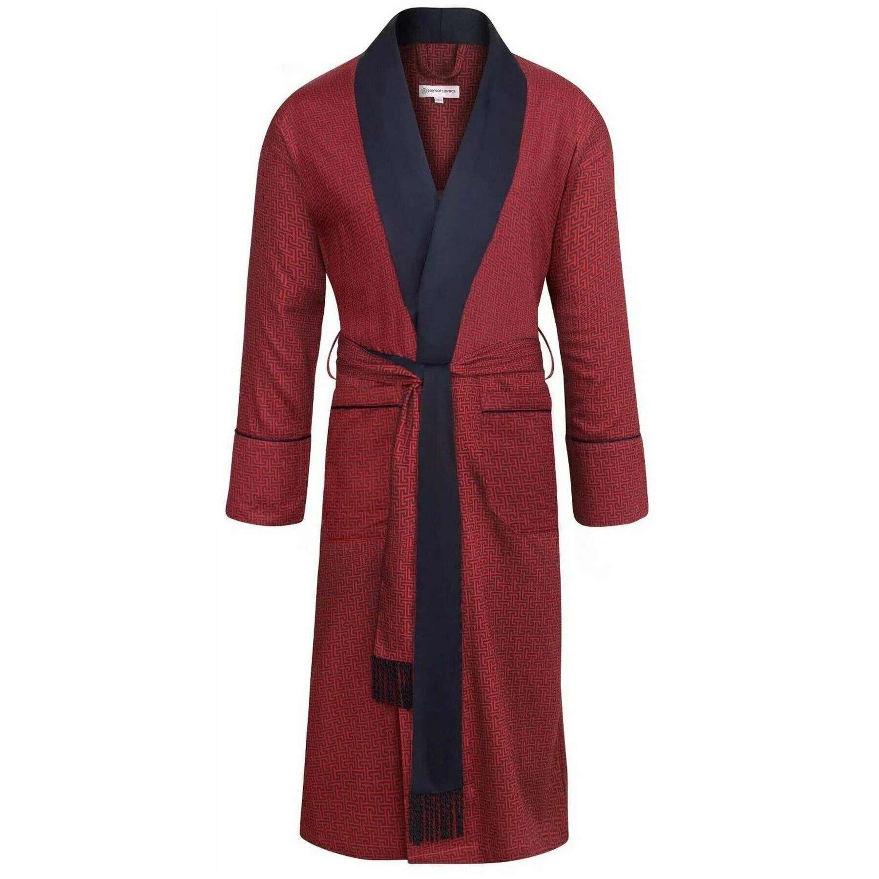 Brought to you by the brand Bown of London, this burgundy labyrinth men's cambridge lightweight dressing gown is made from 100% cotton, 200 gsm weight. Also the burgundy labyrinth dressing gown is designed in a unique pattern, It is recommended to wash on a 40 degree cotton cycle to keep this dressing gown in good condition. All the dressing gowns come complete with bown of london dust bag. The Bown of London Cambridge Lightweight Dressing Gown - Burgundy Labyrinth is beautifully crafted from the softest fabric to give you optimal comfort when relaxing. The satin shawl collar and lined cuffs contrast elegantly so you re sure to lounge in style. Featuring two front pockets and an adjustable belt, comfort and practicality is paramount. Luxuriously stylish, this robe is perfect for any gentleman.