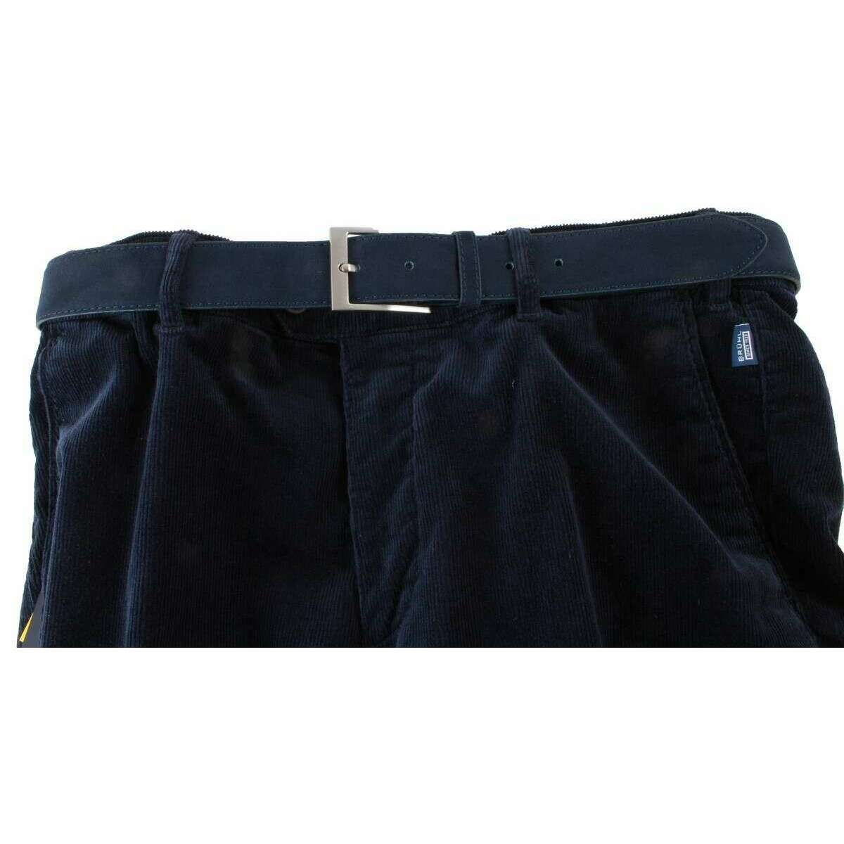 These men's parma b giza cotton fine cord trousers by the brand BRUHL are made from 99% cotton and 1% elastane and are showcased in navy. Also the navy trousers are designed in a plain pattern, It is recommended to wash at 40 degrees to keep these trousers in good condition. All the trousers come complete with bruhl tags. The BRUHL Parma B Giza Cotton Fine Cord Trousers - Navy are crafted from luxurious Giza cotton, offering a soft and refined finish that feels exceptional to wear. These trousers are designed to combine classic tailoring with modern comfort, making them a versatile choice for any occasion. They feature a stretch waistband that provides flexibility and ensures a comfortable fit throughout the day. There are two quarter pockets at the front for easy access and two button-through pockets at the back for secure storage. The design includes eight belt loops, giving a neat and structured look when worn with a belt. The bottom width measures 16 inches, creating a balanced and contemporary silhouette. Perfect for smart-casual outfits or office wear, the BRUHL Parma B trousers deliver sophistication without compromising on comfort.