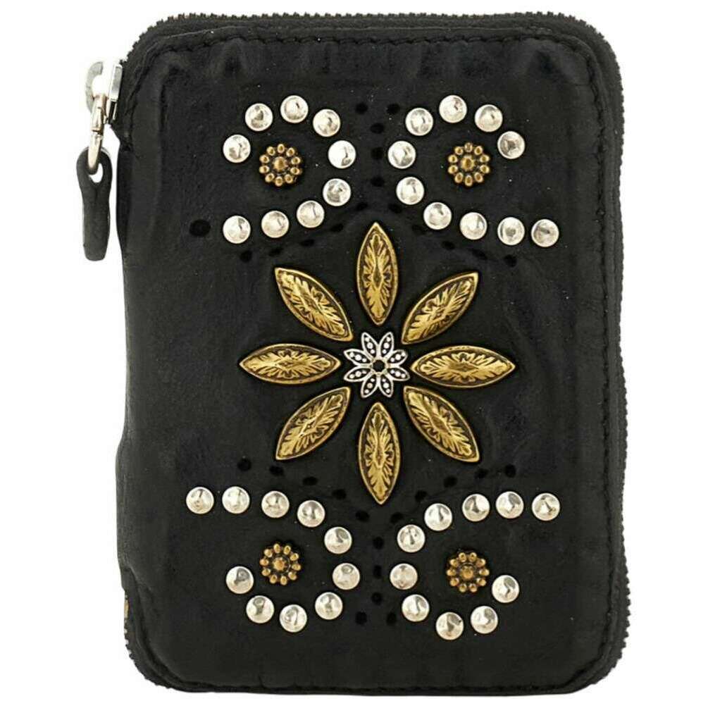 Introducing this women's tosca siena zip purse by Campomaggi, it is manufactured from 100% vegtable tanned cowhide leather in a black colour. It measures 14cm(height) x 10cm(width) x 1.5cm(depth). Campomaggi have made this tosca siena zip purse in Italy. All the purses come complete with campomaggi packaging. The Campomaggi Tosca Siena Zip Purse - Black is a compact yet striking accessory that reflects the brand s signature Italian craftsmanship. Made from vegetable?tanned cowhide leather, it showcases the natural beauty of the material while developing character with every use. The front is enhanced with an elegant stud and drill design, adding a refined decorative touch to its timeless silhouette. Secured with a smooth zip closure, the purse opens to a thoughtfully arranged interior featuring one closed pocket, one open pocket, and four card holders. This practical layout makes it easy to keep cards, cash, and small essentials organised in a slim, easy?to?carry format. Handmade in Italy, the Campomaggi Tosca Siena Zip Purse blends artisanal quality, everyday functionality, and distinctive embellishment, making it a stylish companion for any occasion.