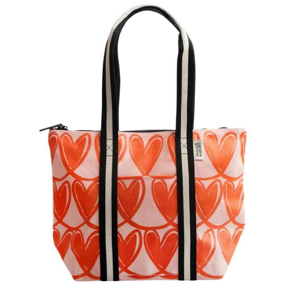 This women's linked hearts overnight bag has been made from 100% pvc coated cotton, featured in a pink colour and is from the brand Caroline Gardner. It measures 32cm(height) x 47cm(width) x 17cm(depth). All the bags come complete with caroline gardner tags. The Caroline Gardner Linked Hearts Overnight Bag - Pink/Orange brings a touch of charm to any luggage look with its hand?printed looped hearts design in vibrant orange and pink. A smaller version of the brand s classic Weekend Bag, it offers versatile use as a shopper, an everyday carry?all, or a compact overnight travel bag. Designed with sturdy grab handles for easy carrying, it blends style with practicality in a perfectly sized silhouette. Part of the Looped Hearts range, it s a cheerful and functional addition to any wardrobe.