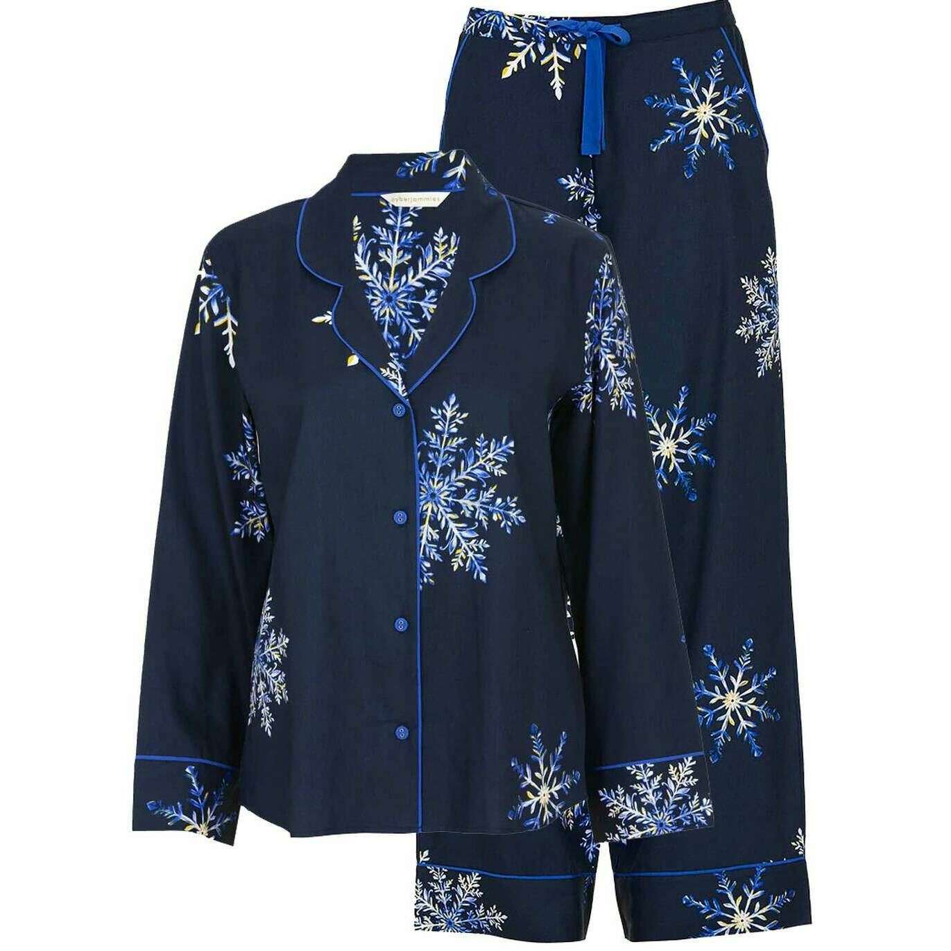 These women's frosty snowflake pyjama set by the brand Cyberjammies are made from 60% cotton and 40% modal and are showcased in navy. Also the navy pyjamas are designed in a unique pattern, It is recommended to machine wash inside out, do not soak, wash with like colours to keep these pyjamas in good condition. All the pyjamas come complete with cyberjammies tags. The Cyberjammies Frosty Snowflake Pyjama Set - Navy is perfect for embracing winter comfort. Made from a soft cotton-modal blend, this set features a delicate snowflake print on a deep navy background for a cosy, seasonal look. The top includes a revere collar, shaped hem, and blue modal-covered buttons, while the wide-leg bottoms offer an elasticated back, flat front, adjustable drawstring, and side pockets for ease. Finished with subtle modal piping, this set is perfect for slow mornings, long nights, and festive lounging.