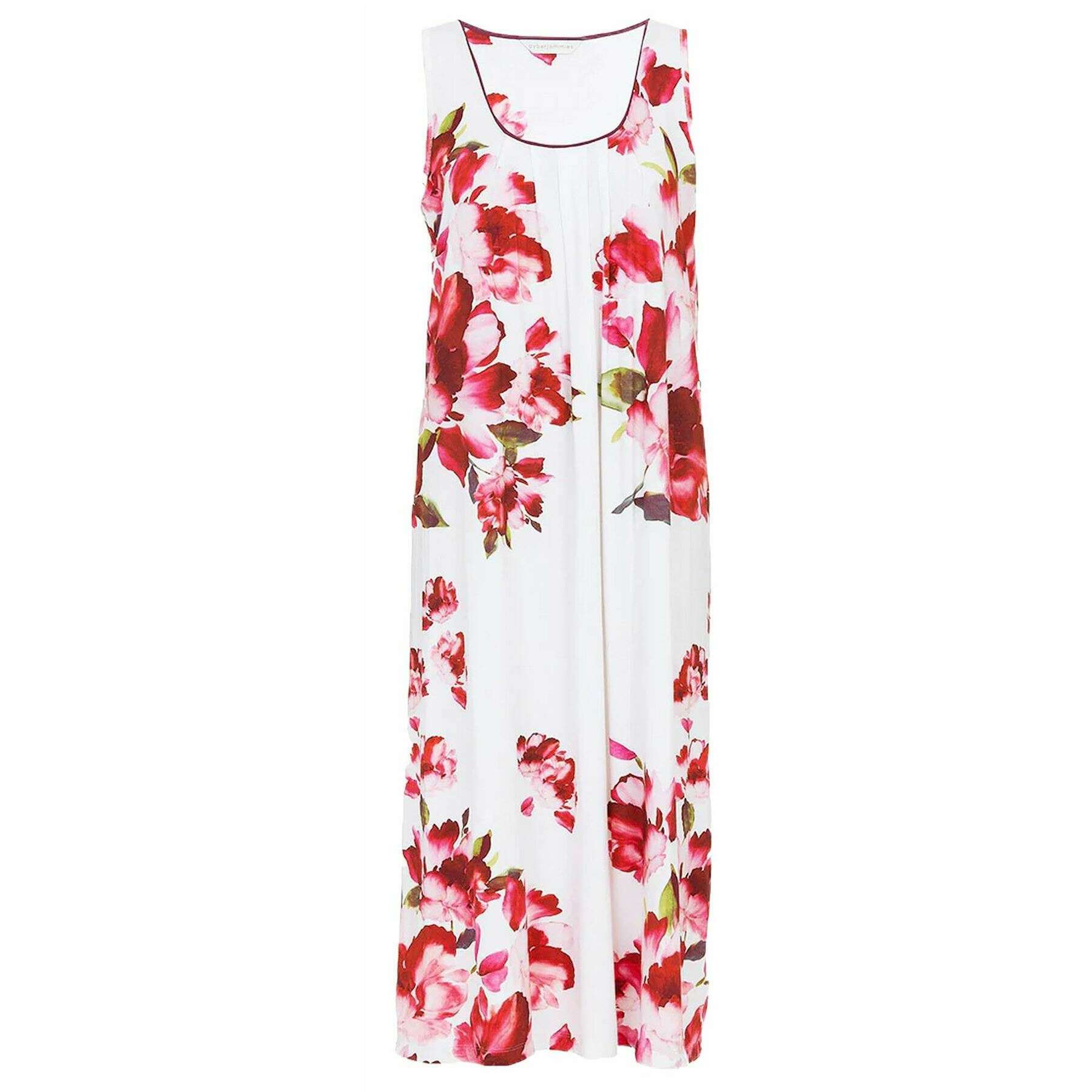 These women's isabella floral printed jersey long nightdress by the brand Cyberjammies are made from 52% cotton, 41% modal and 7% elastane and are showcased in pink. Also the ox blood burgundy/pink pyjamas are designed in a floral pattern, It is recommended to machine wash inside out, do not soak, wash with like colours to keep these pyjamas in good condition. All the pyjamas come complete with cyberjammies tags. The Cyberjammies Isabella Floral Printed Jersey Long Nightdress - Ox Blood Burgundy/Pink adds elegance to your sleepwear. Crafted from a soft jersey blend of cotton, modal, and elastane, this piece offers comfort with a touch of stretch. Featuring a delicate red floral print on a fresh white base, it s finished with oxblood piping along the scoop neckline and wide straps. Generous pleats create a flowing silhouette that s flattering on its own or layered under a dressing gown. Perfect for relaxed mornings and cosy evenings, this nightdress is a timeless addition to your collection.