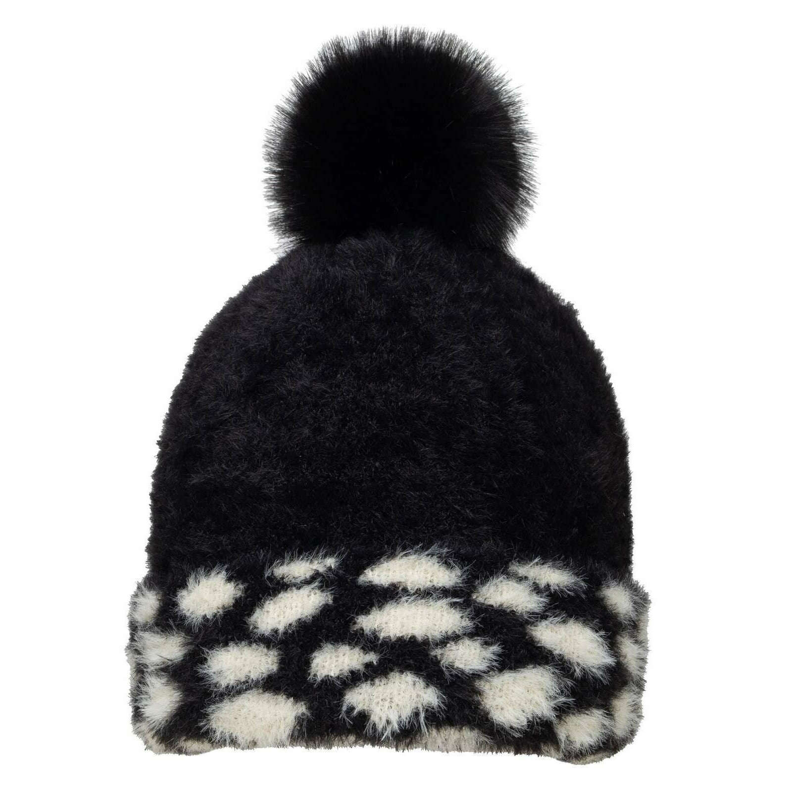 Manufactured from 100% nylon is this black women's knitted spotty bobble hat by the designer Dents. Also the black hat is designed in a plain pattern, It is recommended to hand wash only to keep this hat in good condition. All the hats come complete with dents tags. The Dents Knitted Spotty Bobble Hat - Black is a stylish piece to add a modern look to your collection for the colder seasons due to the fun faux fur pom pom on the top and the trendy black and white leopard print design. An upturned ribbed brim makes sure that your head and ears are cosy and warm at all times, protecting you from the coldest of weathers.