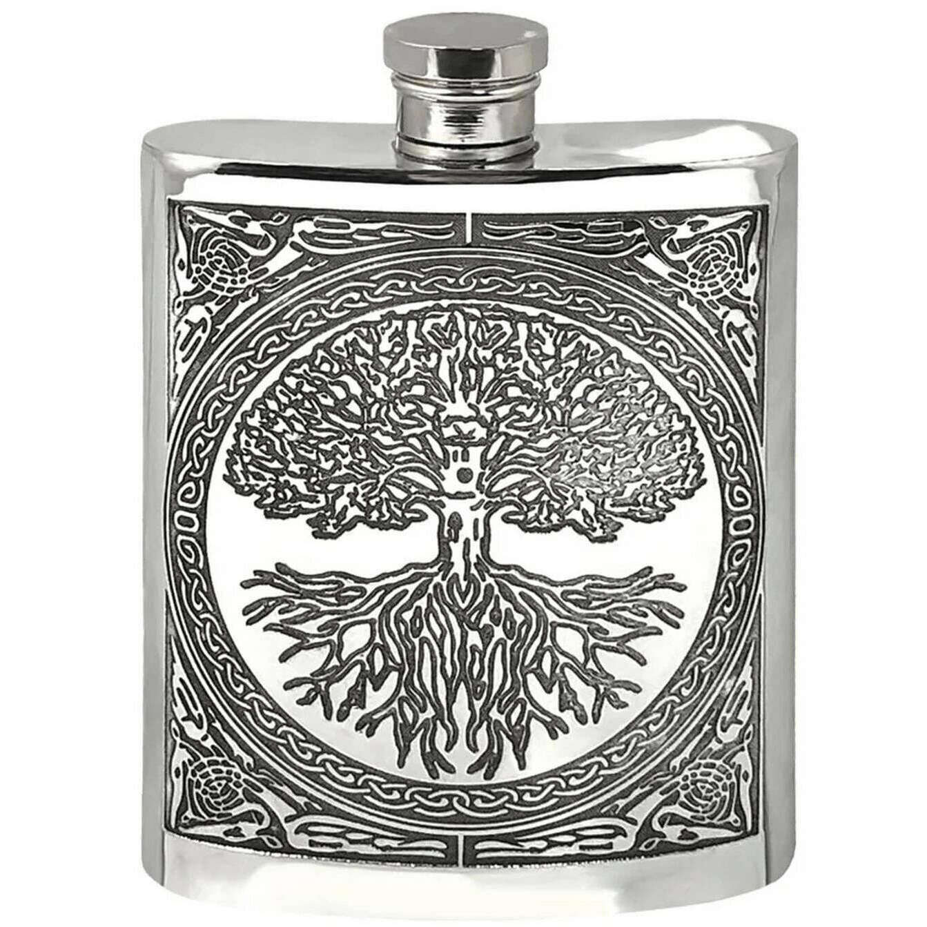 This 6oz celtic tree of life flask for men or women is fashioned by the brand English Pewter Company in a silver colour and is made from pewter. It measures 13cm(height). All the hip flasks come complete in a english pewter company gift box. The English Pewter Company 6oz Celtic Tree of Life Flask - Silver has been crafted to an exquisite standard, ensuring it doesn't tarnish over time, giving you a long-term companion. Perfect for storing your favourite drink and allowing you to sip it on the go, keeping it fresh so that every sip is just as good as the last. It features a stunningly intricate Celtic design engraved on the front making it a must have for your collection.