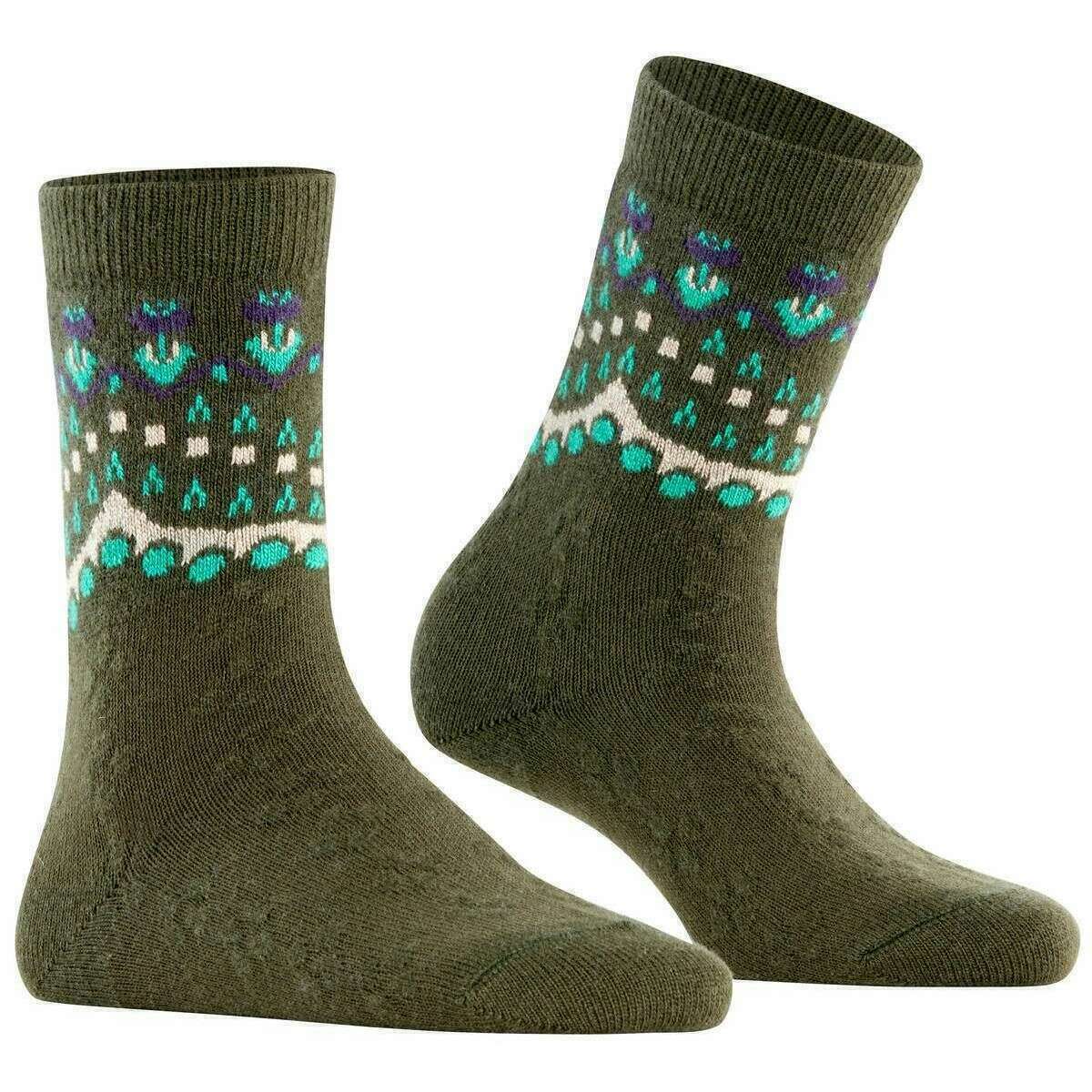These cosy wool special edition socks for women are fashioned by the brand Falke in a green colour and are made from 31% wool, 26% rayon, 24% polyamide (6% recycled), 18% cashmere and 1% elastane. Also the artichoke green socks are designed in a unique pattern, It is recommended to machine wash at 30 degrees to keep these socks in good condition. All the socks come complete with falke sock tags. The Falke Cosy Wool Special Edition Socks - Artichoke Green are so comfortable, light, undeniably soft and pleasantly warm. This pair is part of the 130 year anniversary collection meaning these are a premium pair that features a winter folk motif with delicate, feminine accents, such as floral elements and subtle embellishments. Thanks to reinforced stress zones and Falke-We-Care-Wool, these sustainable socks offer optimal durability you can count on whilst being environmentally friendly. Perfect for casual outfits with solid boots or ankle boots, these socks will give you a snug, stay in place Falke Perfect Fit, while the warming cashmere pampers your feet all day long.