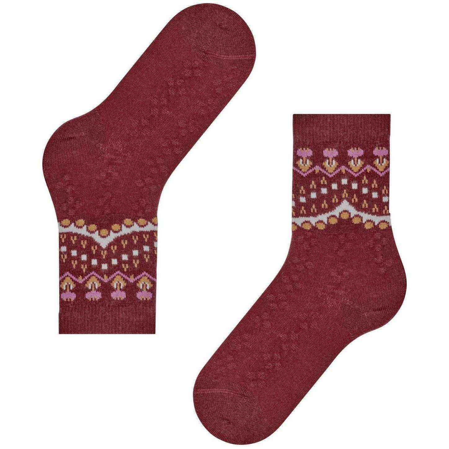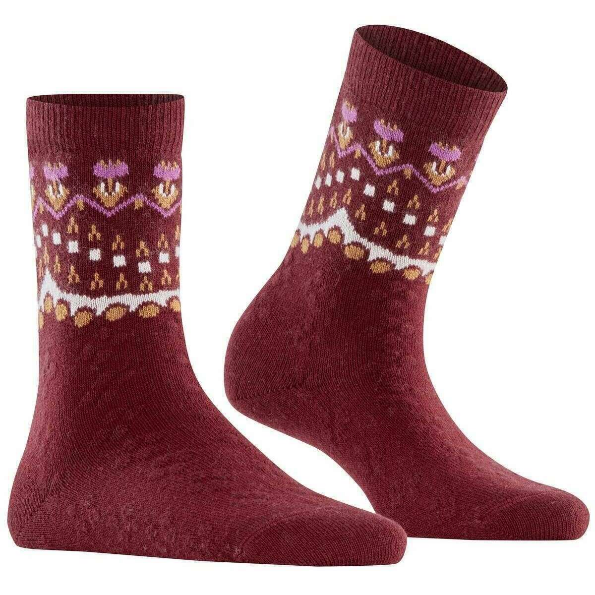 These women's cosy wool special edition socks by the brand Falke are made from 31% wool, 26% rayon, 24% polyamide (6% recycled), 18% cashmere and 1% elastane and are showcased in red. Also the cayenne red socks are designed in a unique pattern, It is recommended to machine wash at 30 degrees to keep these socks in good condition. All the socks come complete with falke sock tags. The Falke Cosy Wool Special Edition Socks - Cayenne Red are so comfortable, light, undeniably soft and pleasantly warm. This pair is part of the 130 year anniversary collection meaning these are a premium pair that features a winter folk motif with delicate, feminine accents, such as floral elements and subtle embellishments. Thanks to reinforced stress zones and Falke-We-Care-Wool, these sustainable socks offer optimal durability you can count on whilst being environmentally friendly. Perfect for casual outfits with solid boots or ankle boots, these socks will give you a snug, stay in place Falke Perfect Fit, while the warming cashmere pampers your feet all day long.