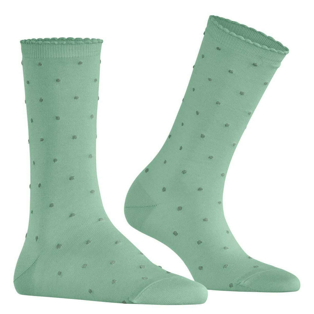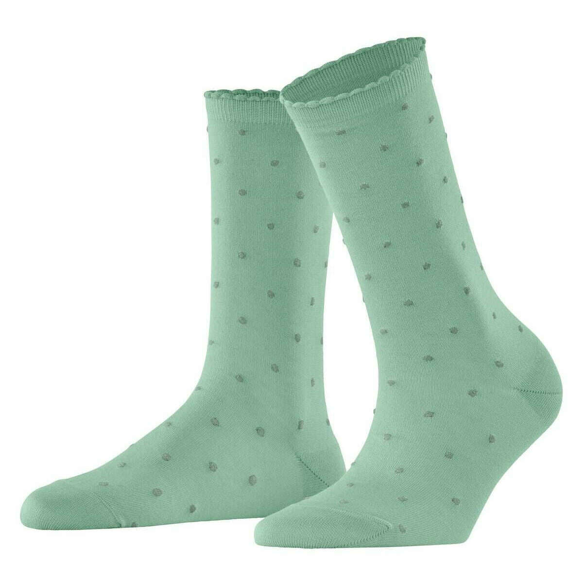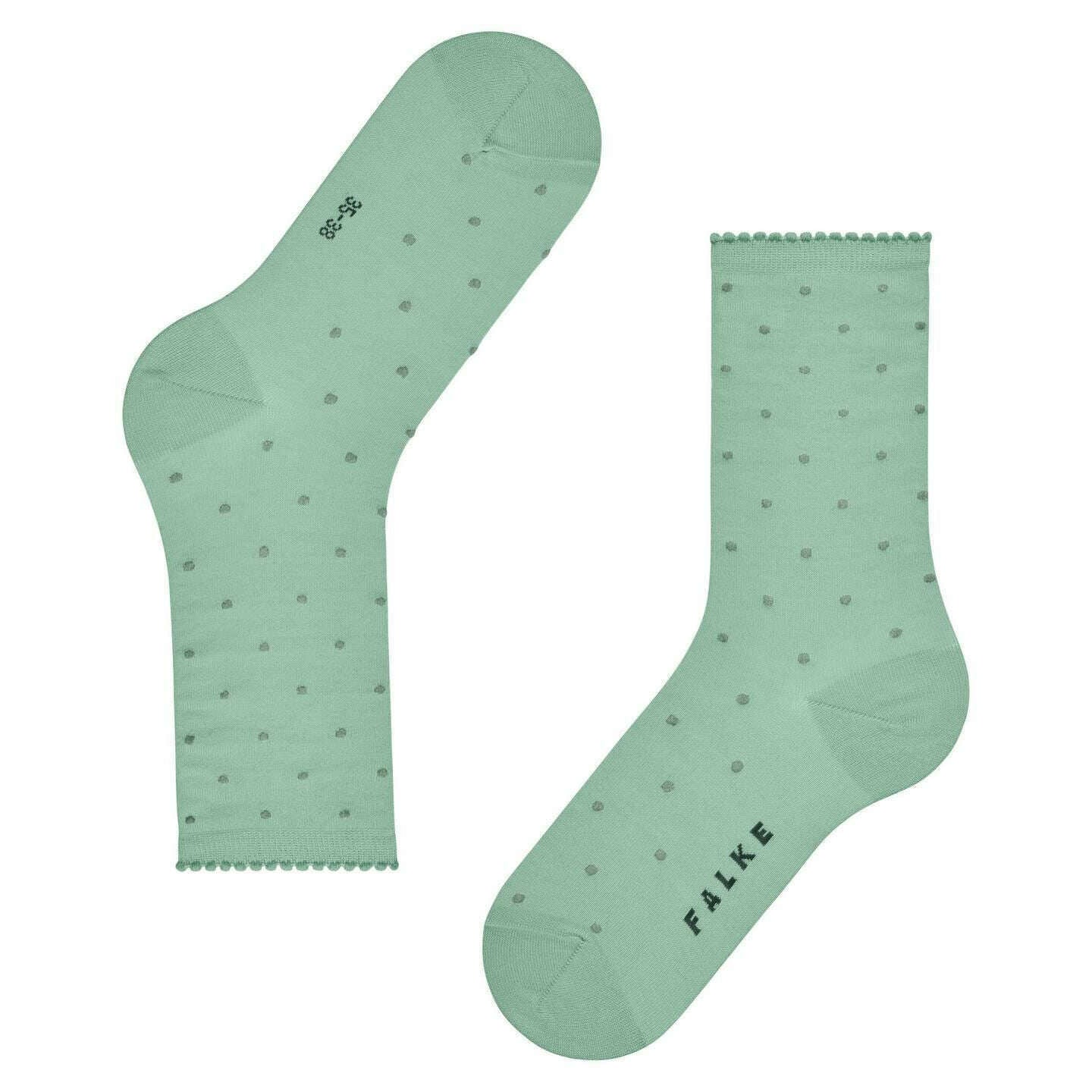 These spike dot socks for women are fashioned by the brand Falke in a green colour and are made from 85% cotton, 10% polyamide, 4% rayon and 1% elastane. Also the jade green socks are designed in a spots pattern, It is recommended to wash at 30 degrees to keep these socks in good condition. All the socks come complete with falke tags. The Falke Spike Dot Socks - Jade Green combine a feminine dot design with the skin-friendly comfort of FALKE WE CARE COTTON. Their fine, contrasting dots create a timeless and elegant look, making them a versatile accessory that complements both casual and chic outfits. The slightly ruffled cuff enhances their feminine appeal, while the smooth knitted background provides a refined finish. Made from sustainable, mercerised organic cotton, they reflect FALKE s commitment to resource saving, socially responsible, and traceable materials. Reinforced stress zones ensure lasting durability, and the signature FALKE Perfect Fit guarantees exceptional comfort throughout the day. Bringing together sustainable cotton comfort and fashionable design, these socks offer a stylish and responsible choice for everyday wear.