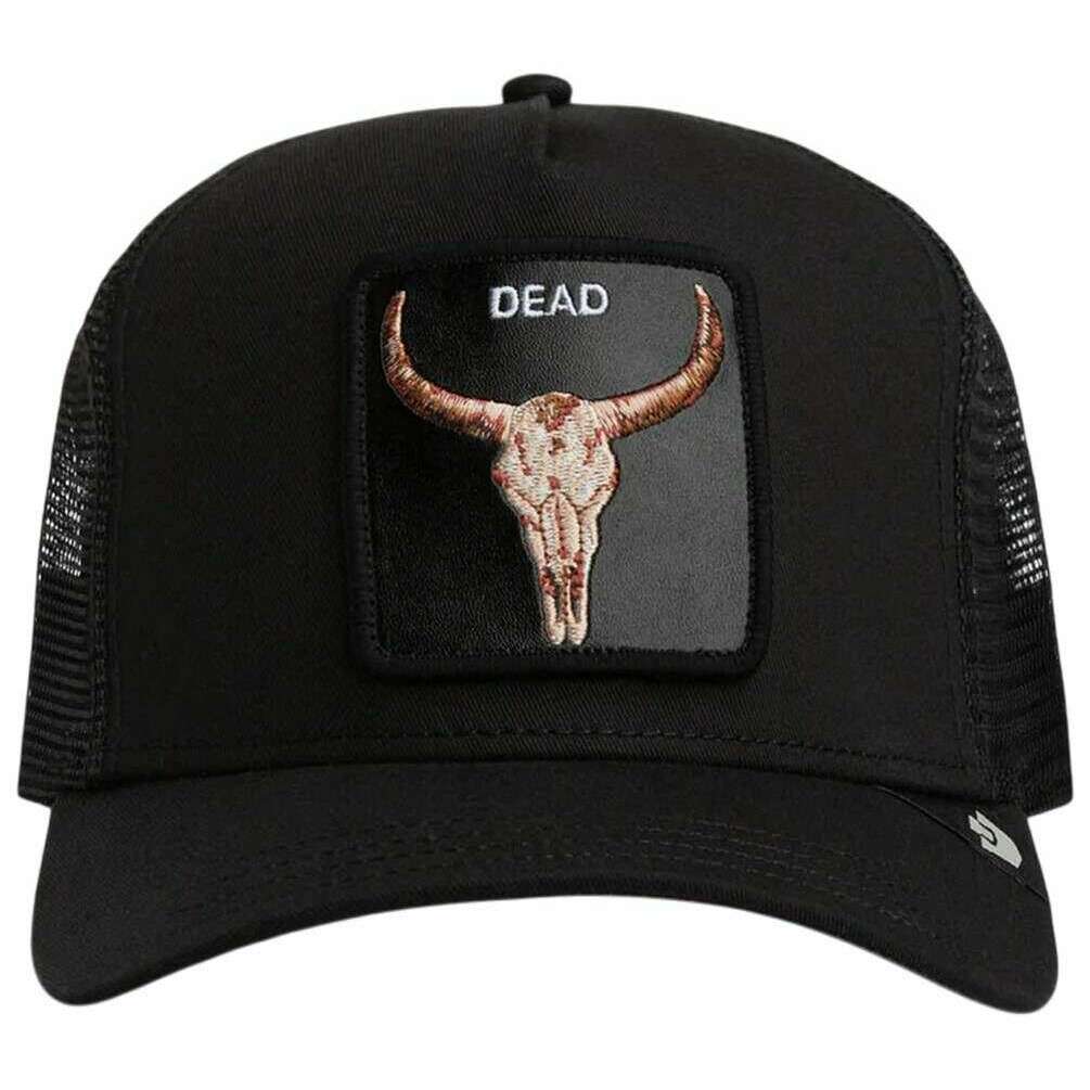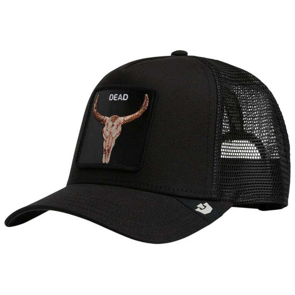 Manufactured from 57% polyester and 43% cotton is this void black unisex dead skull trucker hat by the designer Goorin Bros. All the hats come complete with goorin bros tags. The Goorin Bros Dead Skull Trucker Hat - Void Black brings a fiercely striking aesthetic to any look. Its iconic skull patch, complete with impressive horns, makes an unmistakable statement and defines the cap s powerful character. The deep black front panel contrasts sharply with the glossy, high?impact patch, creating a visual intensity that immediately draws attention. At the same time, the breathable mesh back ensures consistent comfort, making it ideal for everyday wear or as a standout highlight in any streetwear outfit. With its premium craftsmanship, commanding design, and modern silhouette, this cap is perfect for anyone who wants to express their style with confidence and edge. A bold essential for those who dare to stand out.