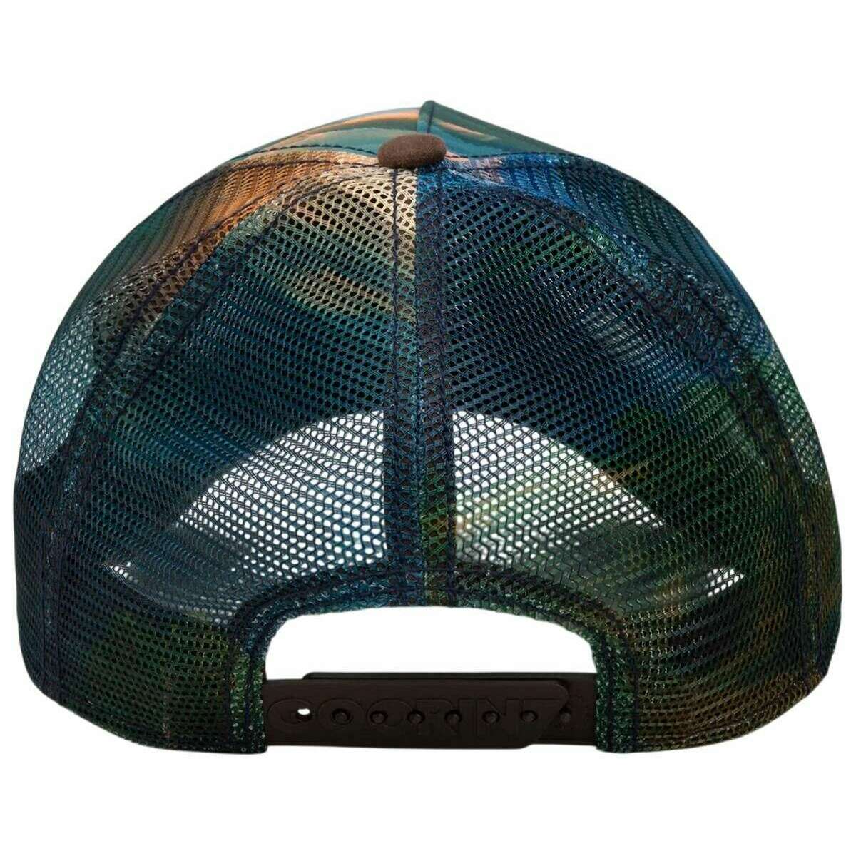 Introducing this unisex eagle in the element trucker hat by Goorin Bros, it is manufactured from 98% polyester and 2% elastane in a ground brown colour. All the hats come complete with goorin bros tags. The Goorin Bros Eagle in the Element Trucker Hat - Ground Brown captures the raw essence of nature in a single striking design. The cap showcases a majestic eagle in full flight, soaring above a dramatic landscape of forest and mountains a motif that embodies strength, freedom, and an unbreakable bond with the wilderness. The intricately embroidered patch serves as a bold focal point on the front, while the printed front panel enhances the atmospheric scenery, creating a vivid interplay of colours and natural elements. With a breathable mesh back, the cap ensures optimal comfort, and the adjustable snapback closure guarantees a custom fit for any adventure. Crafted with premium attention to detail and featuring a vibrant natural design, this cap is perfect for anyone who wants to bring powerful outdoor energy into their everyday look whether for urban life or true outdoor exploration. A standout piece for those who carry the spirit of the wild.