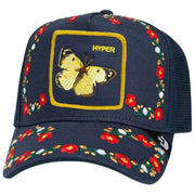 This well made unisex hyper active trucker hat from Goorin Bros comes in a navy colour and is manufactured from 57% polyester and 43% cotton. All the hats come complete with goorin bros tags. The Goorin Bros Hyper Active Trucker Hat - Navy is made for everyone who brings liveliness wherever they go. The embroidered butterfly motif on the front becomes a vibrant focal point, perfectly reflecting the wearer s spirited, dynamic nature. The deep navy blue base paired with a playful floral embroidery pattern adds an extra boost of style and positivity. The breathable mesh back keeps the head cool even when life has you fluttering from A to B while the adjustable snapback closure ensures a flexible, comfortable fit no matter how active the day gets. A must?have accessory for anyone who s always on the move, this cap blends charm, comfort, and unstoppable energy into one eye?catching design.