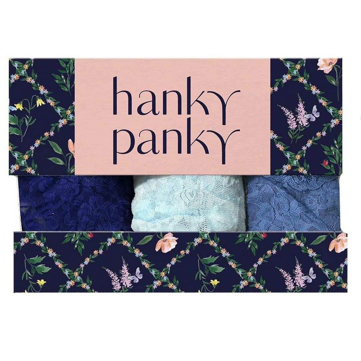 This signature lace original rise 3 pack thong for women is fashioned by the brand Hanky Panky in a blue colour and is made from 100% nylon with 90% nylon, 10% spandex trim and 100% supima cotton. Also the odyssey blue/storm cloud/celeste underwear is designed in a plain pattern, It is recommended to hand wash in cool water with mild detergent and dry flat or hang to dry to keep this underwear in good condition. All the underwear comes complete in a hanky panky presentation box. The Hanky Panky Signature Lace Original Rise 3 Pack Thong - Odyssey Blue/Storm Cloud/Celeste will be certain to impress with its super comfortable fit and feminine design. These thongs have been flawlessly crafted with a design that sits higher on the hips and will give you no visible panty line when wearing for any occasion. Their V-front and V-back waistband will keep these looking stylish on you all year round. Make these the most ideal new underwear you can buy.