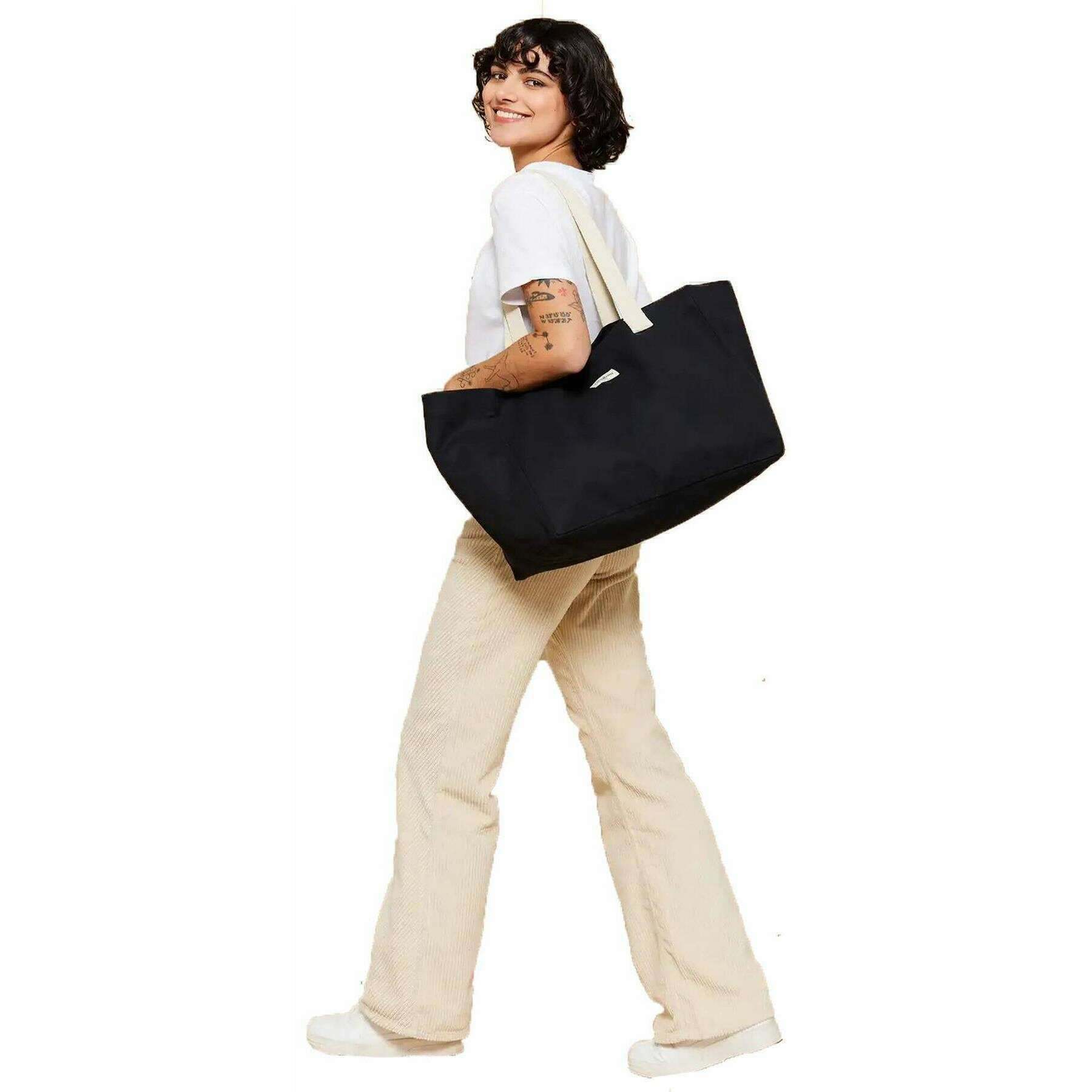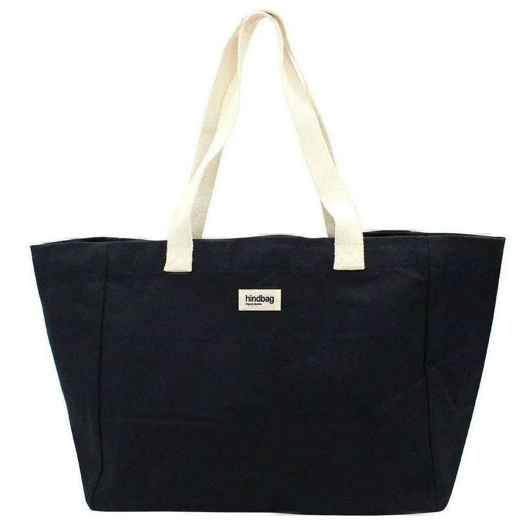Perfect for men or women is this Hindbag black claude beach tote bag, it is also made from 100% organic cotton. It measures 33cm(height) x 40cm(width) x 23cm(depth). All the bags come complete with hindbag packaging. The Hindbag Claude Beach Tote Bag - Black is a versatile and stylish bag crafted from eco-friendly material. This Claude Tote offers a generous 33-liter capacity, making it suitable for various occasions such as shopping, beach outings, or daily commutes. The magnetic snap button ensures the bag remains closed, keeping your belongings secure while allowing easy access.