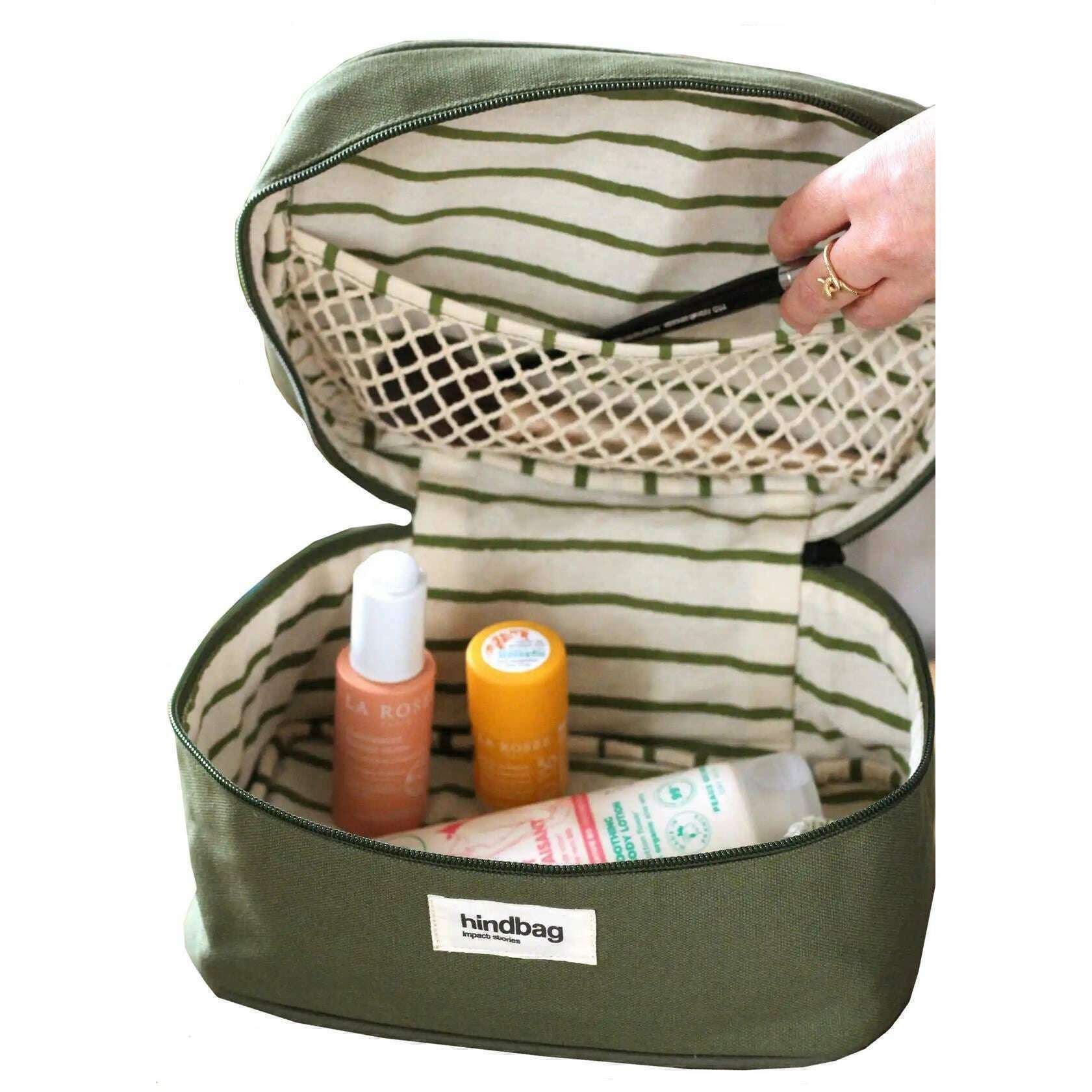 This unisex gaspard vanity bag has been made from 100% organic cotton, featured in a green colour and is from the brand Hindbag. It measures 13.5cm(height) x 16cm(width) x 25cm(depth). All the bags come complete with hindbag packaging. The Hindbag Gaspard Vanity Bag - Olive Green offers travellers and everyday users alike a convenient and stylish way to keep their toiletries organized and accessible. The interior net is perfect for neatly arranging toiletries, cosmetics, and other personal items. Available in a range of colours, this fashionable accessory represents a harmonious fusion of functionality and aesthetics, catering to those who value both style and practicality in their journey.