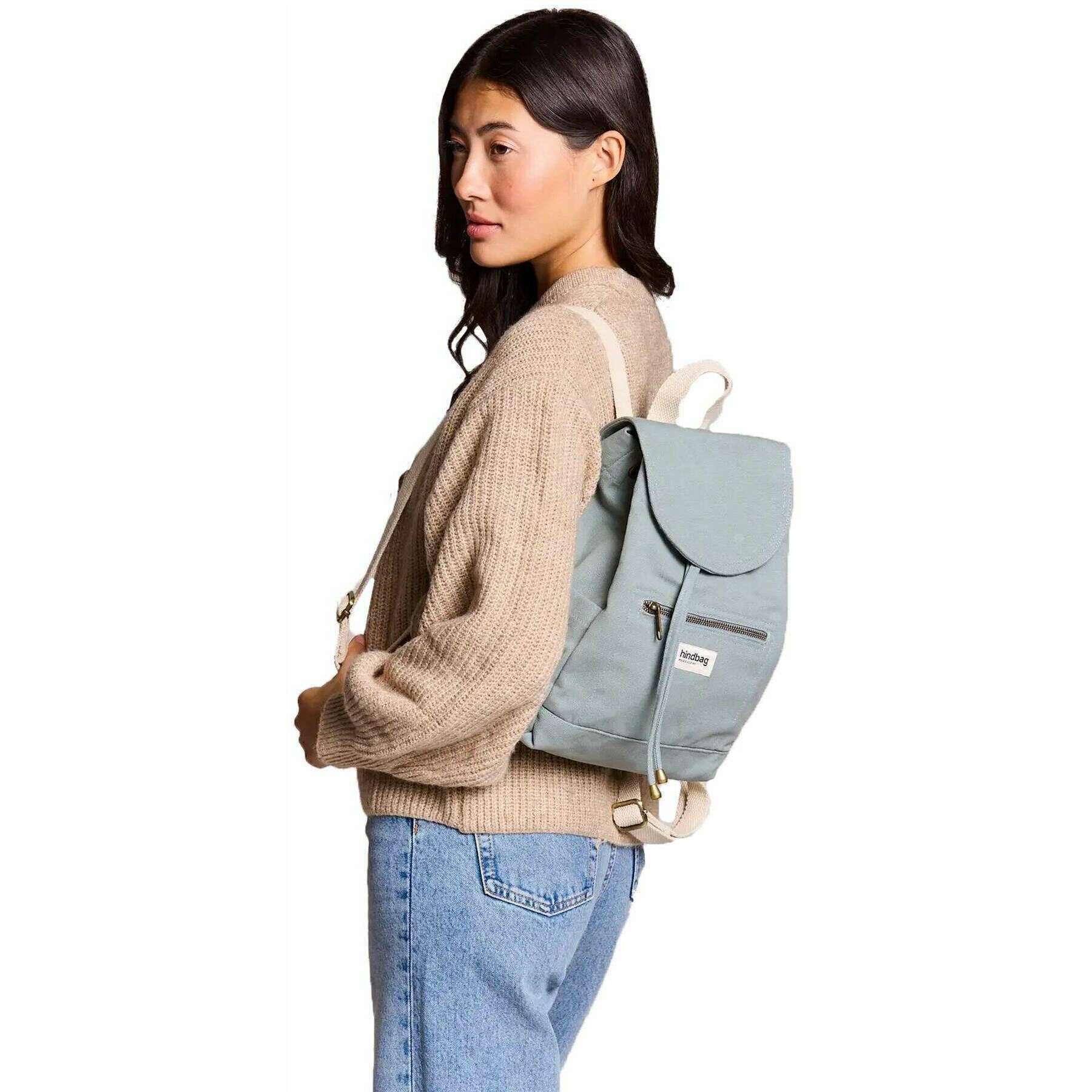 This well made unisex mini eliot small backpack from Hindbag comes in a sage blue colour and is manufactured from 100% organic cotton. It measures 31cm(height) x 24cm(width) x 13cm(depth). All the bags come complete with hindbag packaging. The Hindbag Mini Eliot Small Backpack - Sage Blue is suitable for young and old alike! Featuring two exterior pockets and one interior pocket, you can slip in what you need while keeping your hands free. The timeless design of this mini backpack blend vintage charm with modern functionality, making them a popular choice for daily use.