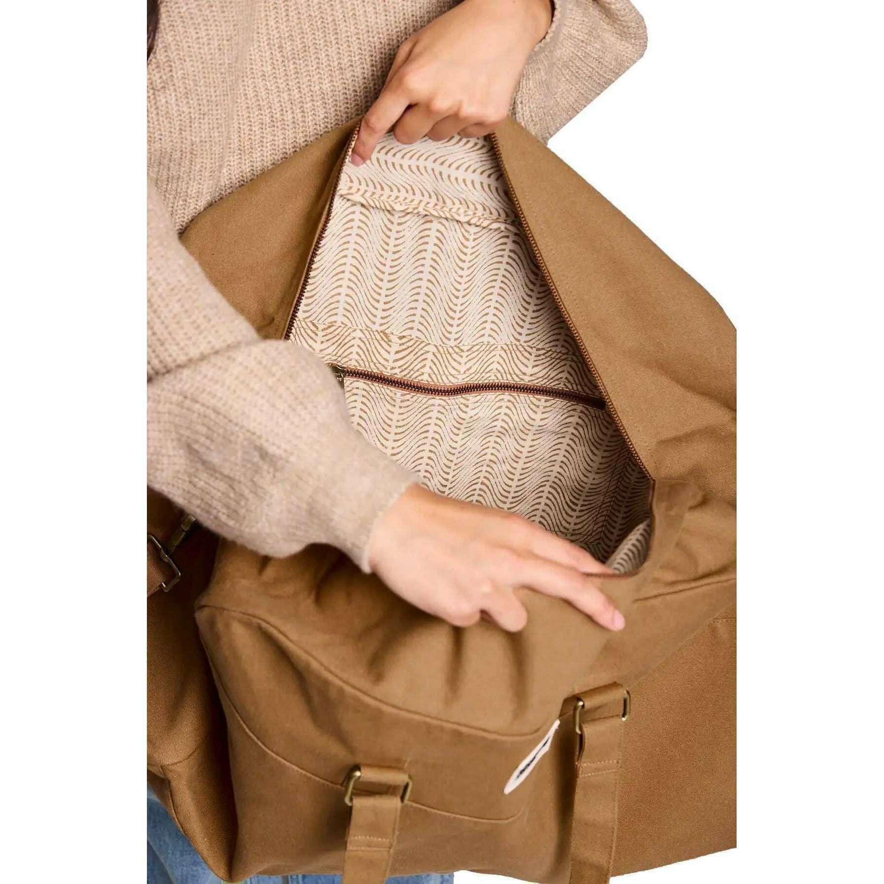 Designer Hindbag has brought you this unisex 100% organic cotton bag using cinnamon brown tones. It measures 33cm(height) x 54cm(width) x 24cm(depth). All the bags come complete with hindbag packaging. The Hindbag Yves Large Travel Bag - Cinnamon Brown is a spacious and eco-friendly option for travellers. Crafted from thick, GOTS-certified organic cotton, this bag features multiple pockets for organization, a secure zipper closure, and a printed inner lining that adds a touch of elegance. With its handles and large adjustable shoulder strap, this bag can be easily carried by hand or on the shoulder.