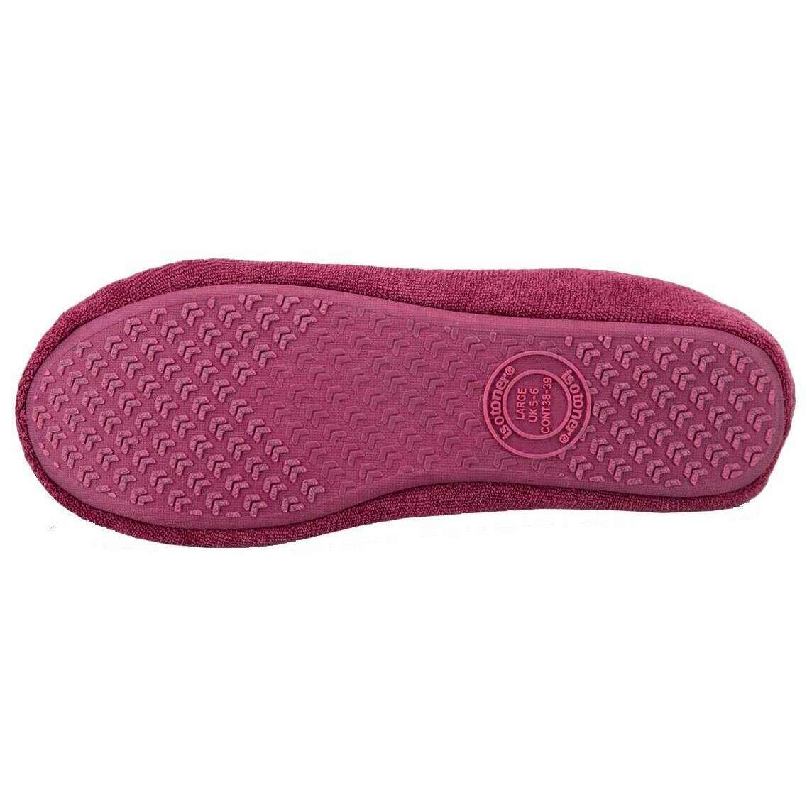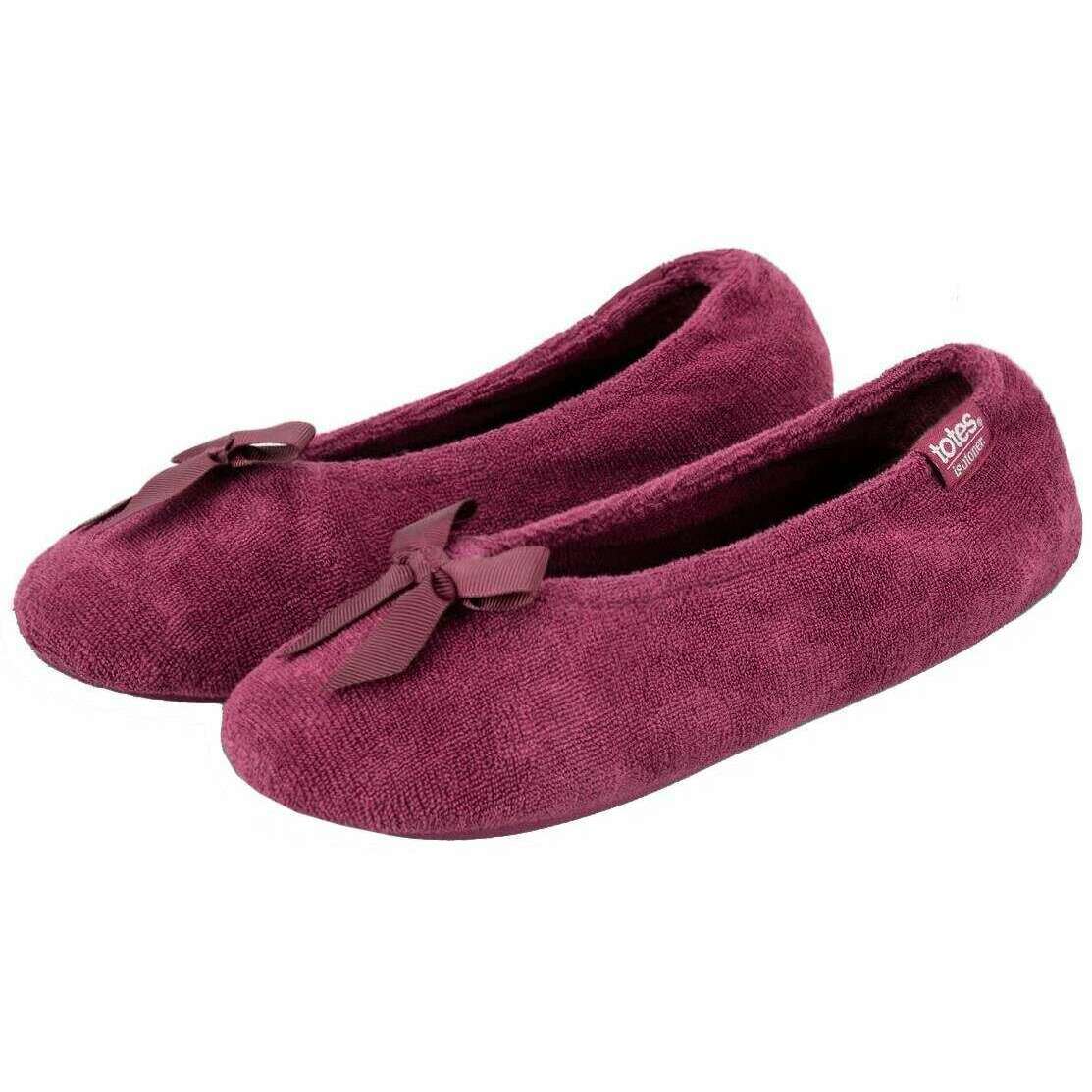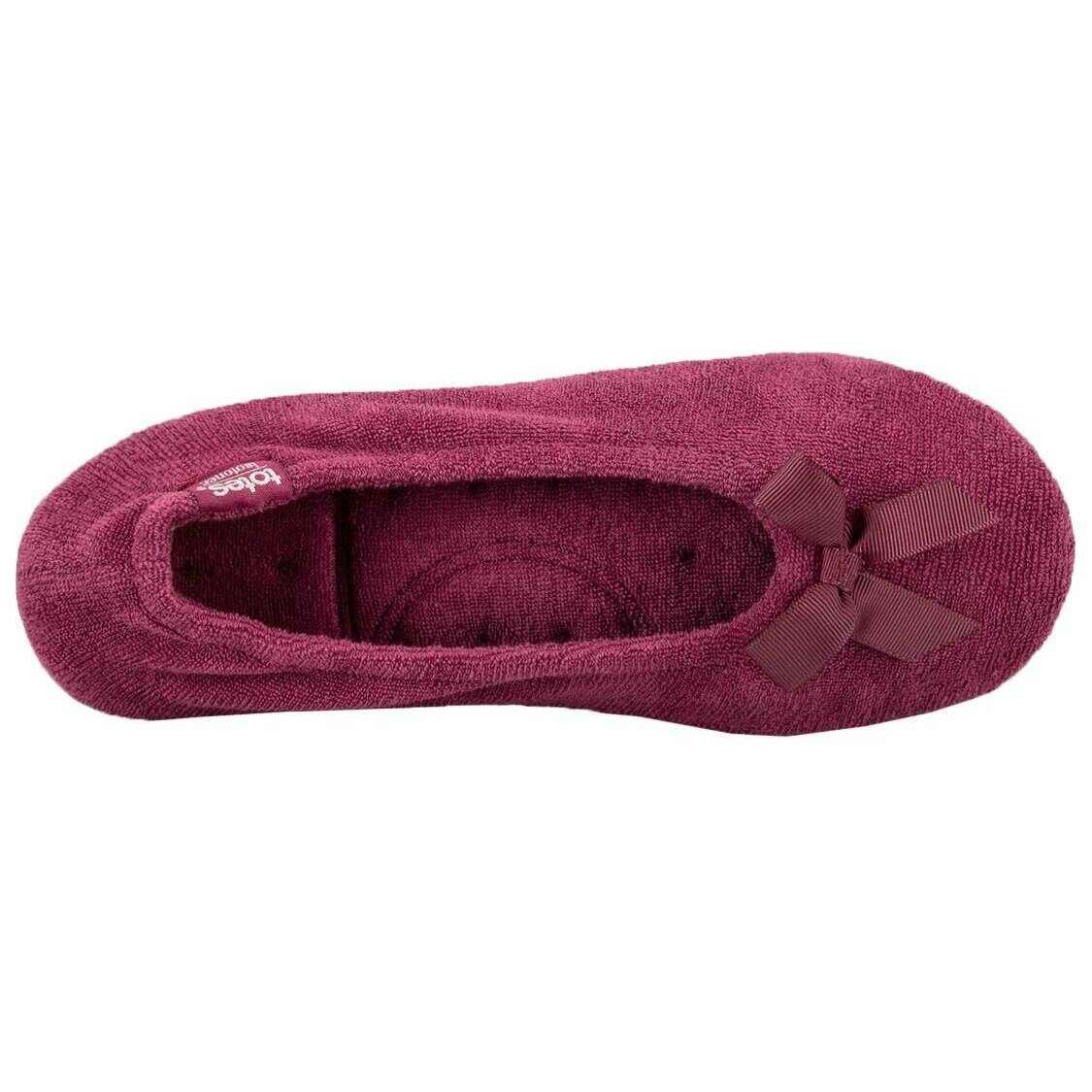 These women's terry ballerina slippers by the brand Isotoner are made from 78% cotton, 17% polyester and 5% elastane and are showcased in burgundy. Also the burgundy slippers are designed in a plain pattern, It is recommended to machine wash at 30 degrees to keep these slippers in good condition. All the slippers come complete with isotoner packaging. The Isotoner Terry Ballerina Slippers - Burgundy are an essential in any lady s collection. Perfect for walking around the house with an added support, warmth and comfort from the pillow step cushioned technology with a foam layer, a durable sole and rich cotton material. The open top design keeps your feet from overheating leaving a breathable feel whilst the textured sole leaves a slip-resistant tread. Finished with a girly bow to complete this gorgeous pair.