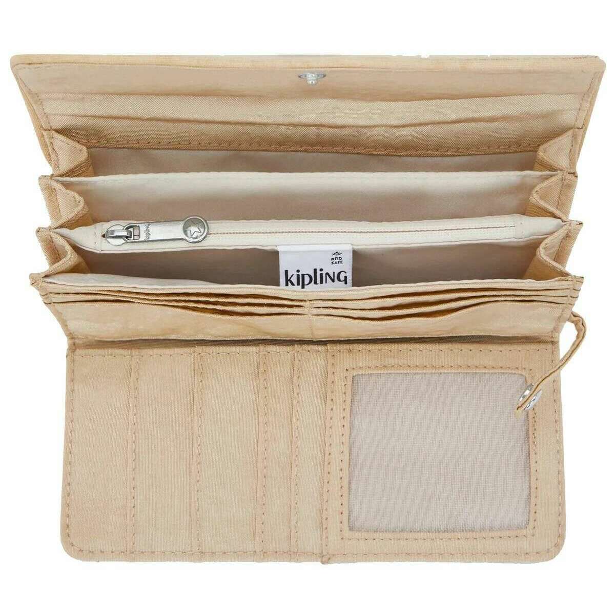 This well made women's money land purse from Kipling comes in a sparkled beige colour and is manufactured from 60% polyamide and 40% recycled polyamide. It measures 10cm(height) x 18.5cm(width) x 3cm(depth). All the purses come complete with kipling packaging. The Kipling Money Land Purse - Sparkled Beige is a must have accessory for fashion forward adults. This simple yet durable wallet features cash compartments, ten credit card slots, an interior zip pouch, and an ID slot for your driver's license or work ID. Designed to keep your essentials safe with a snap button closure, this wallet is perfect for travellers and anyone who is always on the go. RFID technology prevents hackers from skimming data wirelessly by creating a virtual shield to protect your chipped cards.