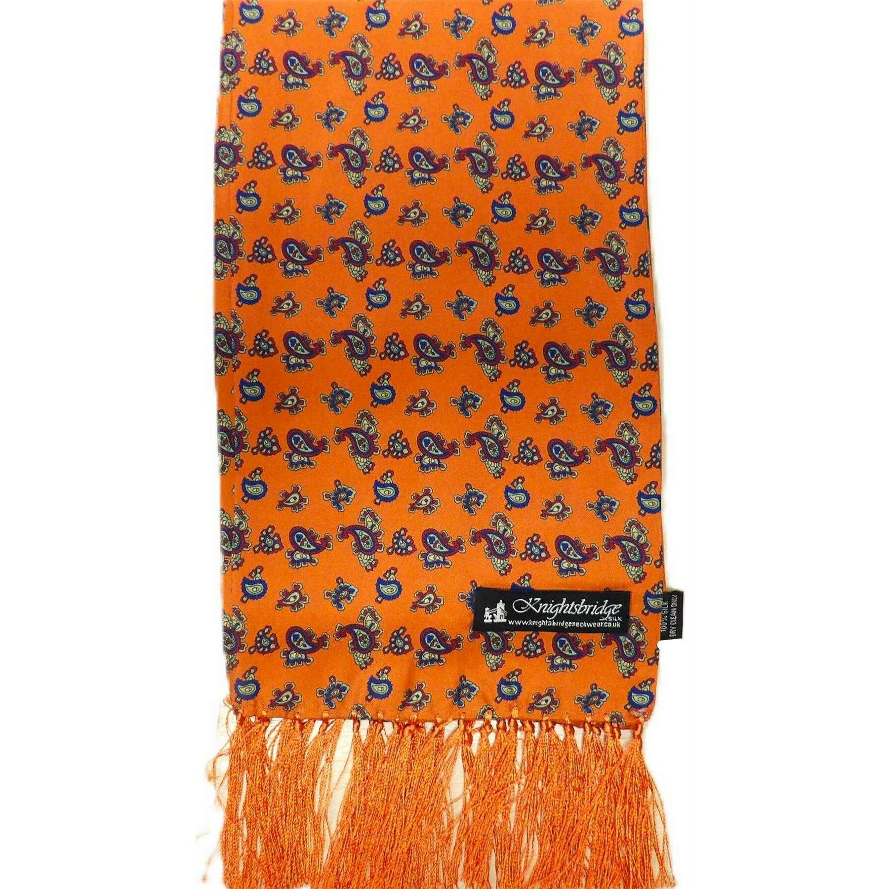 Perfect for men is this Knightsbridge Neckwear burnt orange paisley silk scarf, it is also made from 100% silk. It measures 145cm(height) x 18cm(width). Also the burnt orange scarf is designed in a paisley pattern, It is recommended to dry clean only to keep this scarf in good condition. All the scarves come complete with knightsbridge neckwear tags. The Knightsbridge Neckwear Paisley Silk Scarf - Burnt Orange is a luxurious orange paisley scarf that is sure to draw attention. Being crafted from the finest of silk ensures that you get maximum comfort and a lasting product. The ideal accessory for formal occasions, this truly unique scarf will make the perfect present for any man.