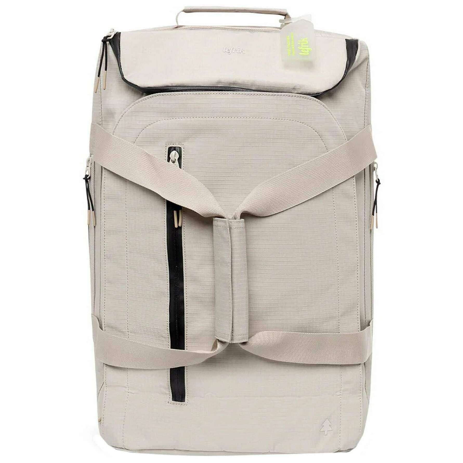 Brought to you by the brand Lefrik, this fossil grey unisex wanderer backpack is made from 100% vegan oxford rpet polyester. It measures 50cm(height) x 33cm(width) x 18cm(depth). It is recommended to cold wash and air dry to keep this bag in good condition. All the bags come complete with lefrik packaging. The Lefrik Wanderer Backpack - Fossil Grey is a compact, eco-friendly travel companion designed for the modern traveller. Featuring a spacious main compartment with elastic bands for clothing, a large mesh flap pocket, side quick-access pockets, and a top shoe compartment, this transforms to the perfect travel bag and has the shape and capacity of a cabin size suitcase and is "under seat" approved. With a special padded compartment for computers up to 13.6", this bag is the perfect companion Whether you're navigating city streets or boarding a flight.