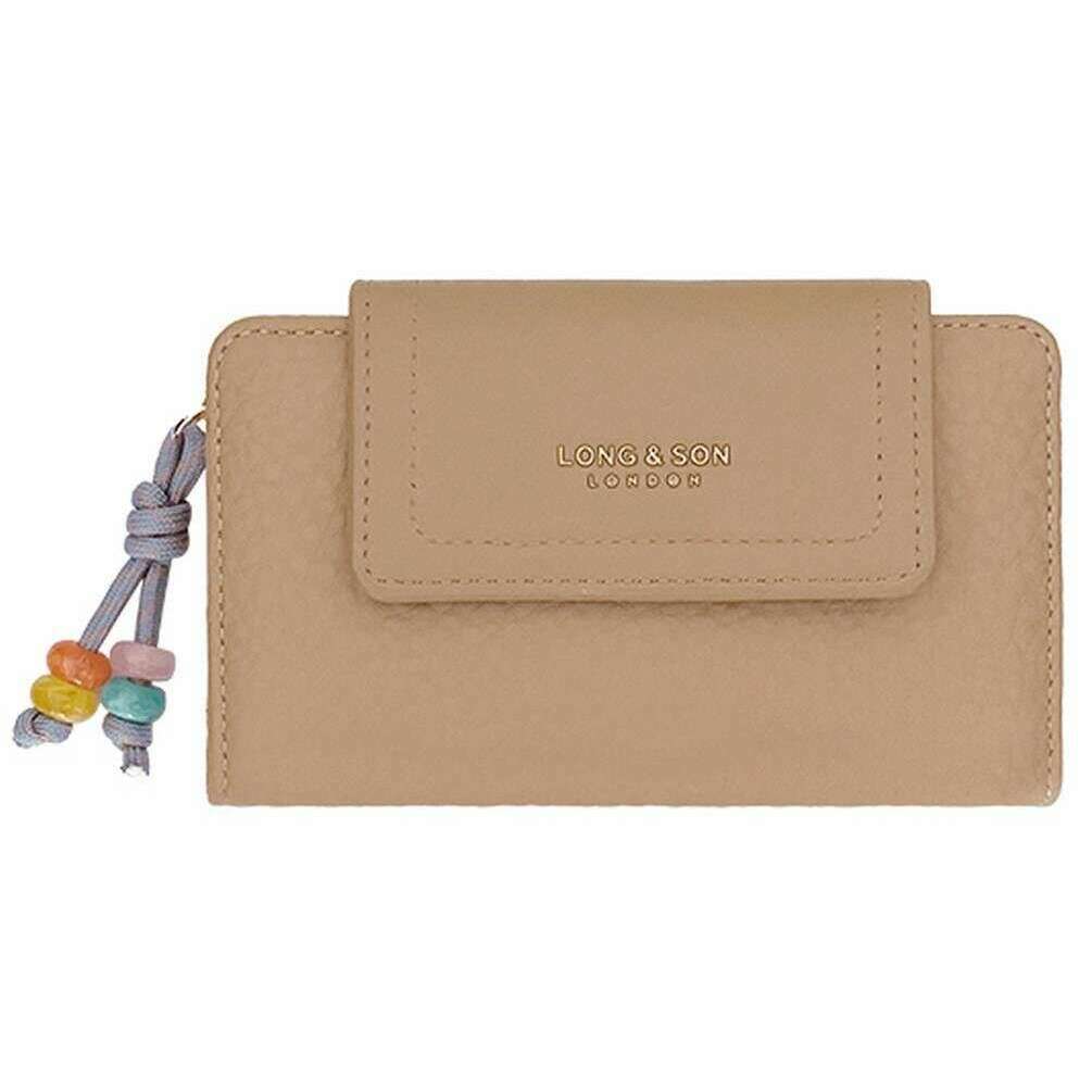Using beige 100% polyurethane, this flap top purse by Long and Son is perfect for women and a must have. It measures 10cm(height) x 15.3cm(width). All the purses come complete with long & son packaging. The Long and Son Flap Top Purse - Khaki Beige offers great storage with lots of room for all your ways of money. Featuring a zipper compartment with two sections and a zipper pocket for loose change, a magnetic section that has six card holders and two identification windows, two receipt pockets and a notes section. What more could you want! This gorgeous design is sleek and sophisticated with a sweet charm for an added pop of colour. Complete with subtle Long & Son branding.