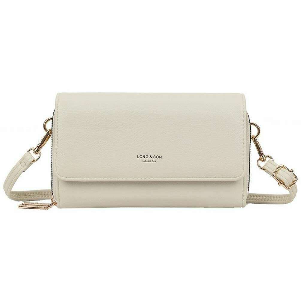 Brought to you by the brand Long and Son, this off white women's purse crossbody bag is made from 100% polyurethane. It measures 12.5cm(height) x 20cm(width) x 5cm(depth). All the bags come complete with long & son packaging. The Long and Son Purse Crossbody Bag - Off White is a must-have if you carry lightly. Featuring multiple sections for your smaller belongings, six card holders and a notes compartment for the convenience of not having to pack a purse. The small and compact style is great for a lightweight wear, and the detachable adjustable strap allows a crossbody or shoulder wear whilst also doubling up as a clutch. Complete with subtle Long & Son branding.