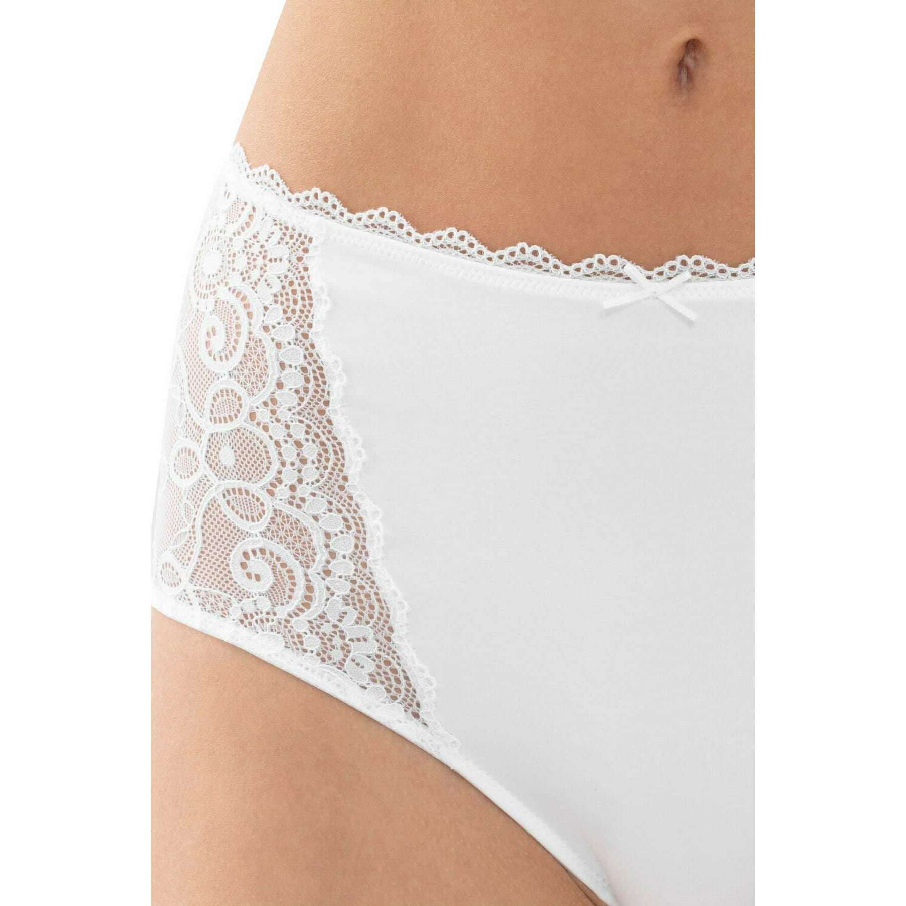 This women's amorous waist pants has been made from 87% polyamide and 13% elastane, featured in a white colour and is from the brand Mey. Also the white underwear is designed in a plain pattern, It is recommended to machine wash at 30 degrees to keep this underwear in good condition. All the underwear comes complete with mey packaging. The Mey Amorous Waist Pants - White are a must-have if you are looking for a basic with a gorgeous touch for a feminine feel. This pair has a high waisted fit, a cotton insert on the gusset, seamless legs and a flat waistband which all contribute to giving optimal comfort for an everyday wear. The lace sides gives an elegant sexy flair.