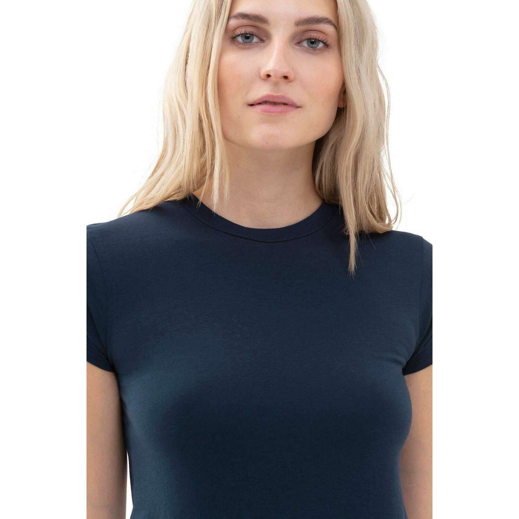 This cotton pure short-sleeved top for women is fashioned by the brand Mey in a blue colour and is made from 94% cotton and 6% elastane. Also the night blue t-shirt is designed in a plain pattern, It is recommended to machine wash at 60 degrees to keep this t-shirt in good condition. All the t-shirts come complete with mey packaging. The Mey Cotton Pure Short-Sleeved Top - Night Blue features 1/2 sleeves and a round neckline with a subtle turtleneck, blending clean simplicity with sporty elegance. Designed for an incredible fit, it offers exceptional comfort and a naturally pleasant feel against the skin. Soft, breathable, and effortless to wear, it s the perfect feel?good essential for everyday comfort.