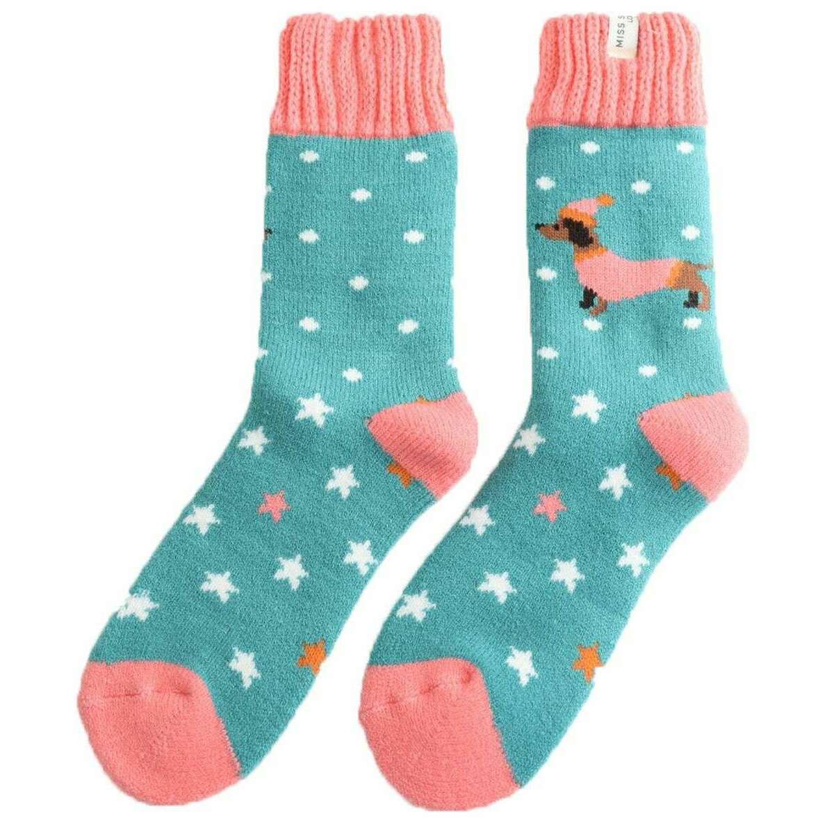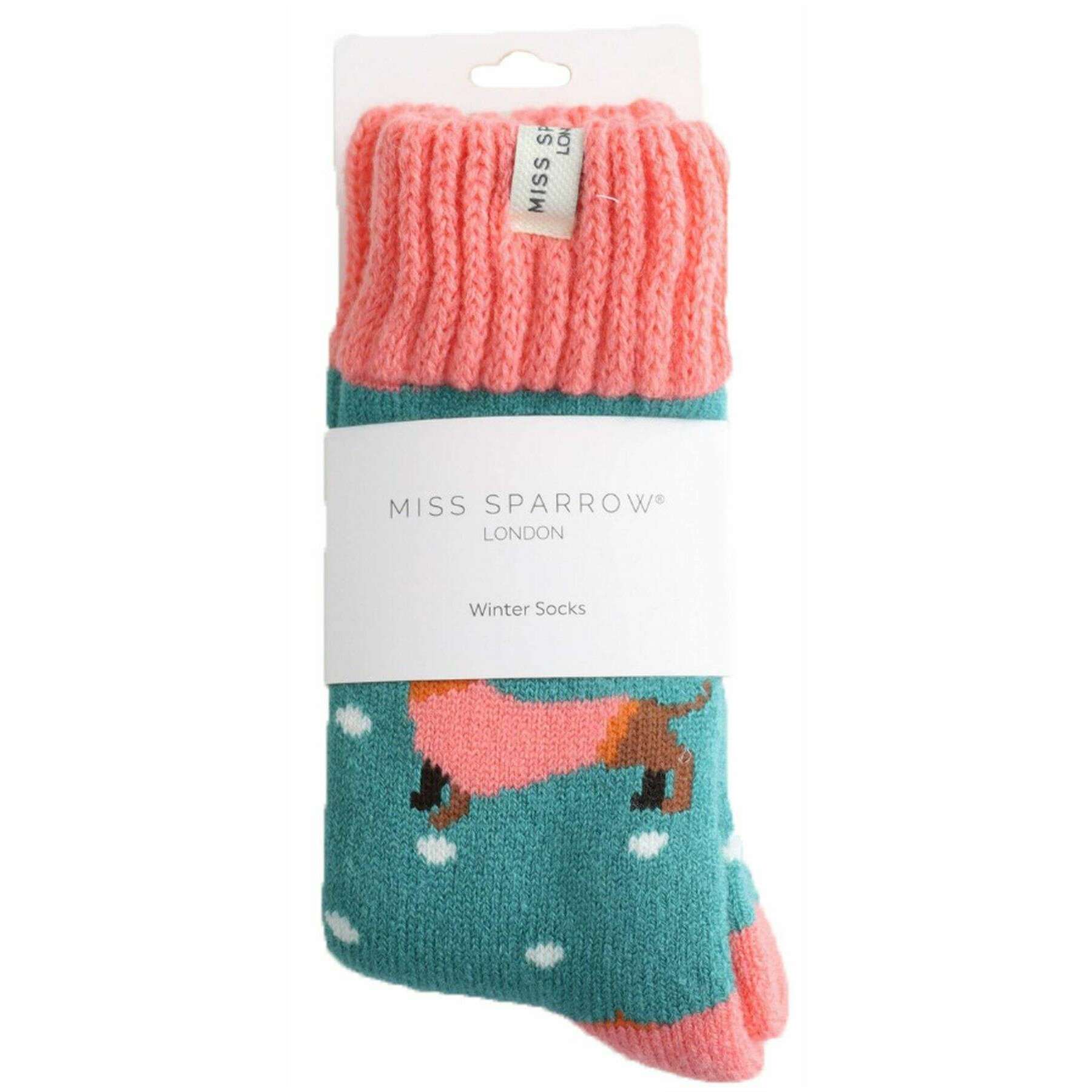 Miss Sparrow London Festive Sausage Dogs Winter Socks - Duck Egg Blue