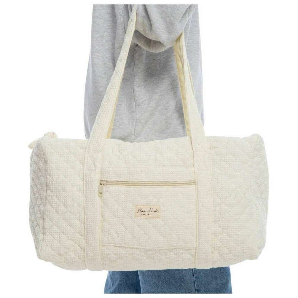 Brought to you by the brand Moon Nude, this cream women's large duffel bag is made from 100% cotton. It measures 30cm(height) x 50cm(width) x 28cm(depth). It is recommended to wash by hand in cold water with a mild detergent, or maching wash inside out on a delicate cycle. to keep this bag in good condition. All the bags come complete with moon nude packaging. The Moon Nude Large Duffel Bag - Cream features a beautiful handmade quilted design. This bag features an exterior zip pocket, a spacious interior and two large handles, perfect for weekend getaways or carrying lots of belongings.
