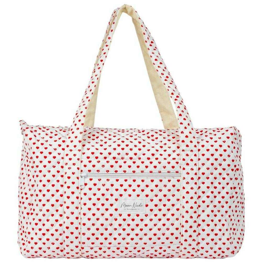 Manufactured from 100% cotton is this white/red women's valentine large duffel bag by the designer Moon Nude. It measures 30cm(height) x 50cm(width) x 28cm(depth). It is recommended to wash by hand in cold water with a mild detergent, or maching wash inside out on a delicate cycle. to keep this bag in good condition. All the bags come complete with moon nude packaging. The Moon Nude Valentine Large Duffel Bag - White/Red features a beautiful handmade quilted design. This bag features an exterior zip pocket, a spacious interior and two large handles, perfect for weekend getaways or carrying lots of belongings.