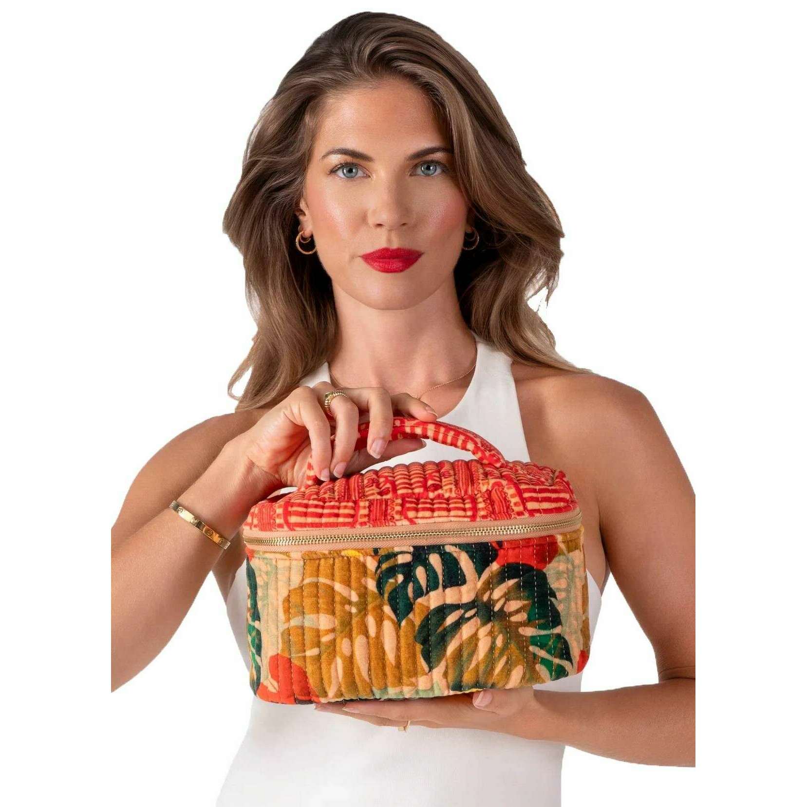 Powder Exotic Leaves Quilted Vanity Case - Red/Green/Beige