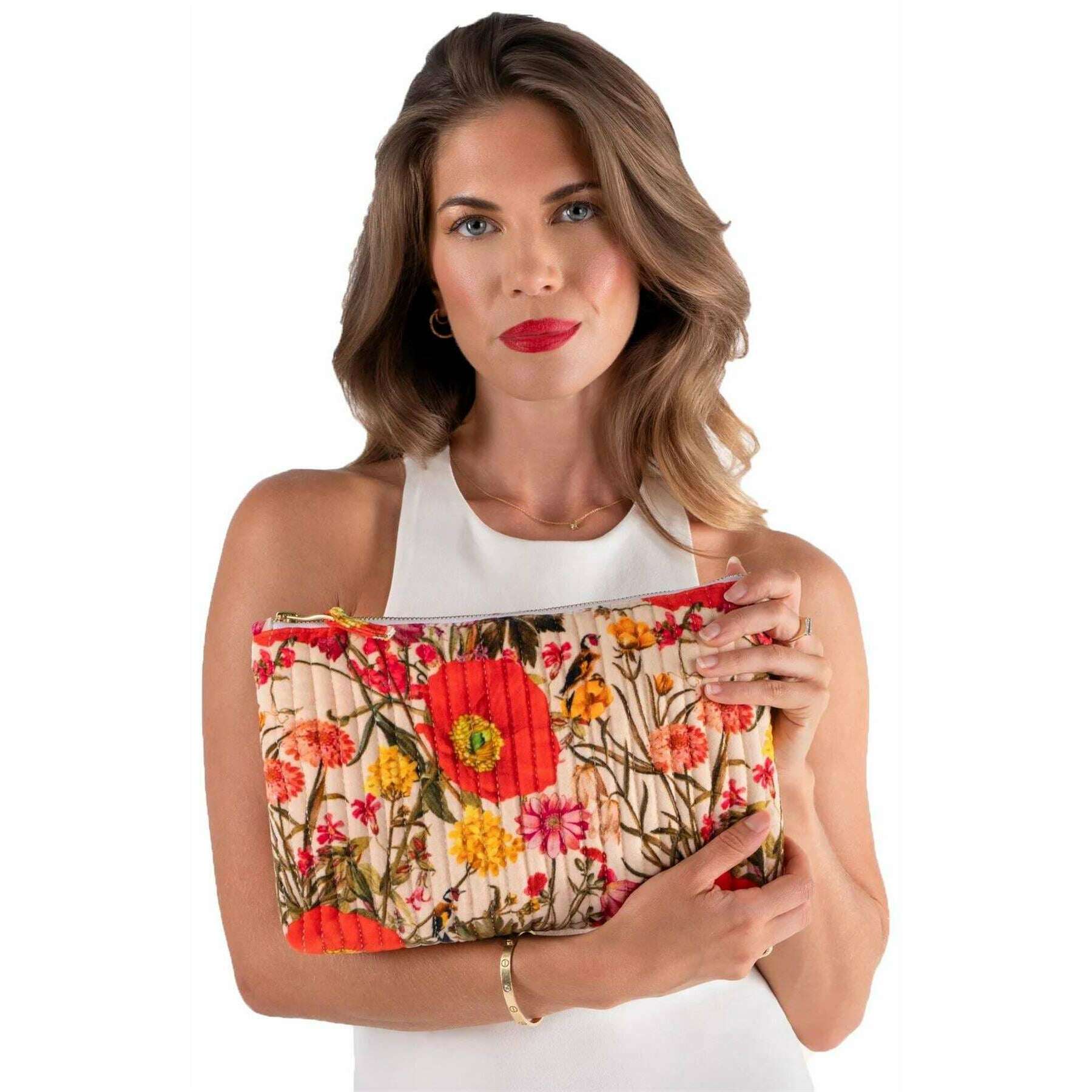 Powder Fine Flowers Quilted Velvet Zip Pouch - White/Red/Beige