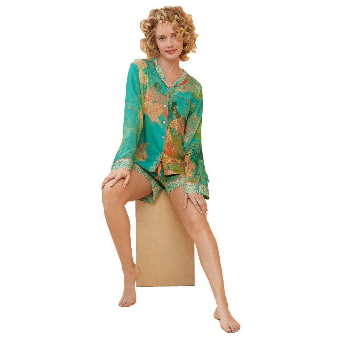 These women's super soft hummingbird pyjamas by the brand Powder are made from 100% modal and are showcased in blue. Also the aqua blue pyjamas are designed in a floral pattern, All the pyjamas come complete with powder tags. The Powder Super Soft Hummingbird Pyjamas - Aqua Blue feature an intricate floral and hummingbird design that is rich in colour thanks to the aqua blue. These vibrant summer PJs with shorts and a long sleeve top create a bold feminine look that you are sure to love.
