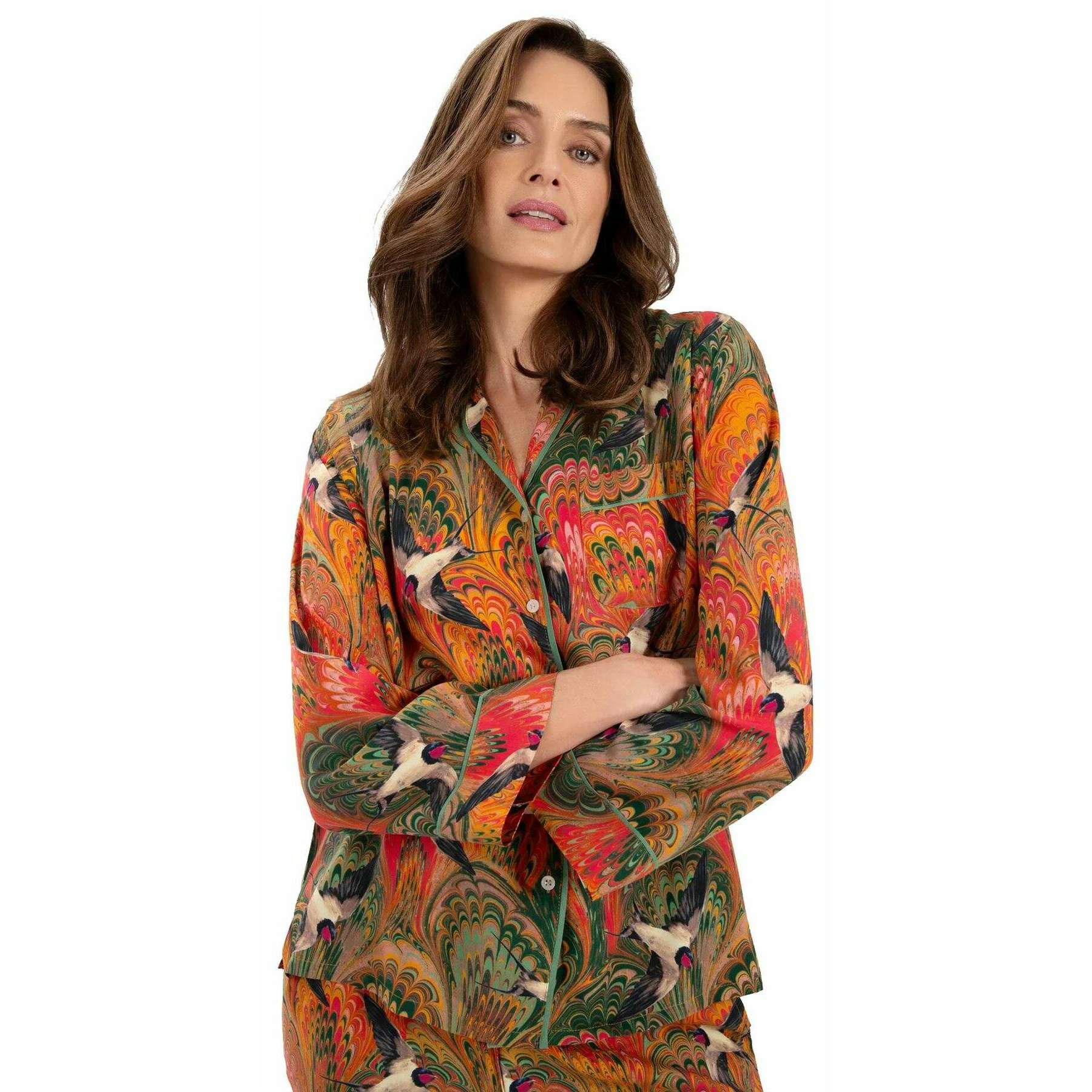 Designer Powder have brought you these women's 100% viscose pyjamas using orange tones. Also the orange pyjamas are designed in a unique pattern, It is recommended to machine wash at 30 degrees to keep these pyjamas in good condition. All the pyjamas come complete with powder tags. The Powder Supersoft Marbled Swallows Pyjamas - Orange feature an combination of two prints with swallows spread across for a psychedelic design that is vibrant and fun, perfect for cosy evenings. These eye-catching PJs with long trousers and a long sleeve top create a bold feminine look that you are sure to love and will want to wear all the time.
