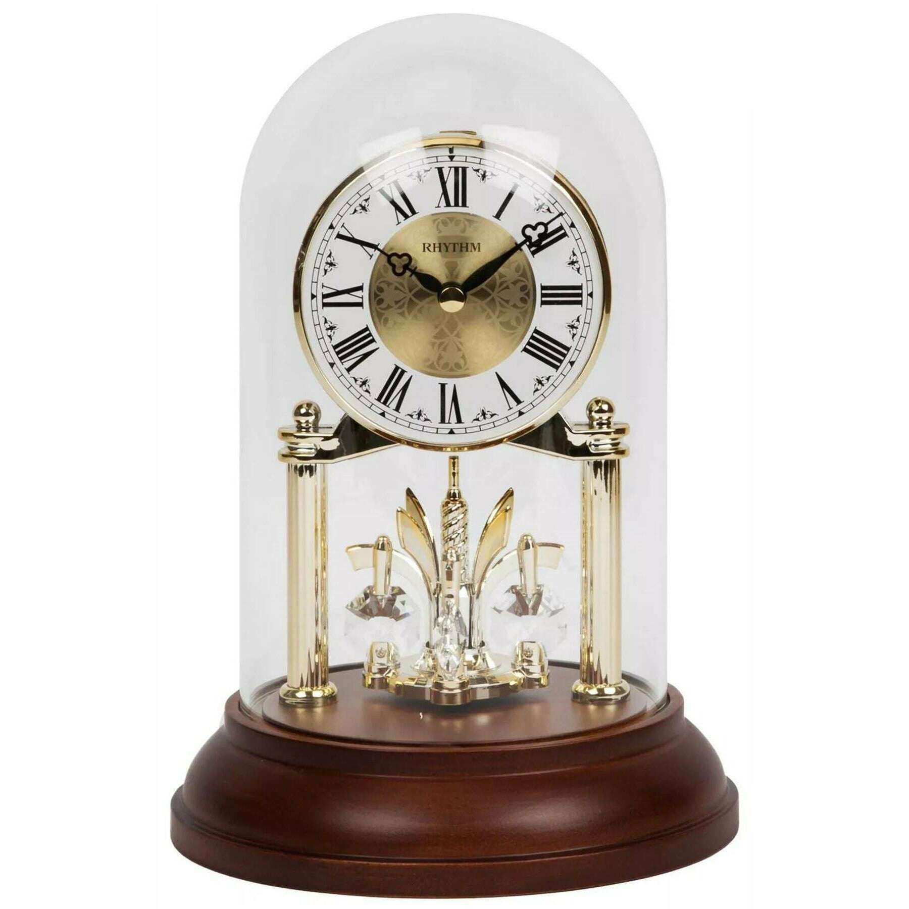 • Rotating Pendulum , Roman Dial , Quartz Movement , 2x AA Battery Type , Bell Jar