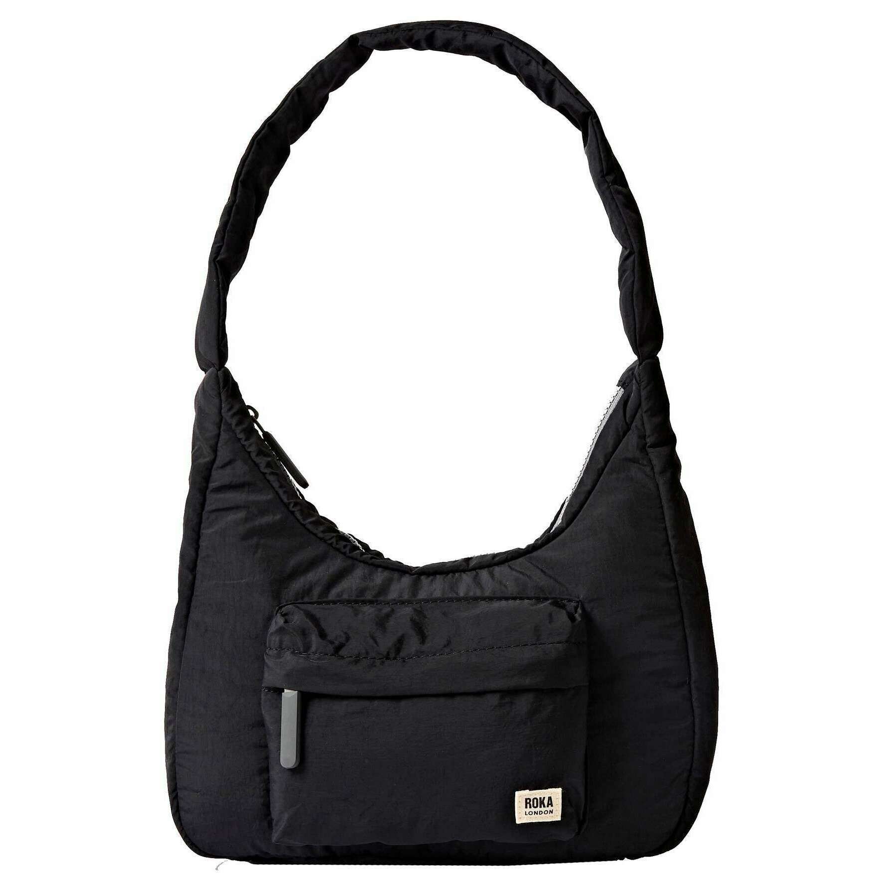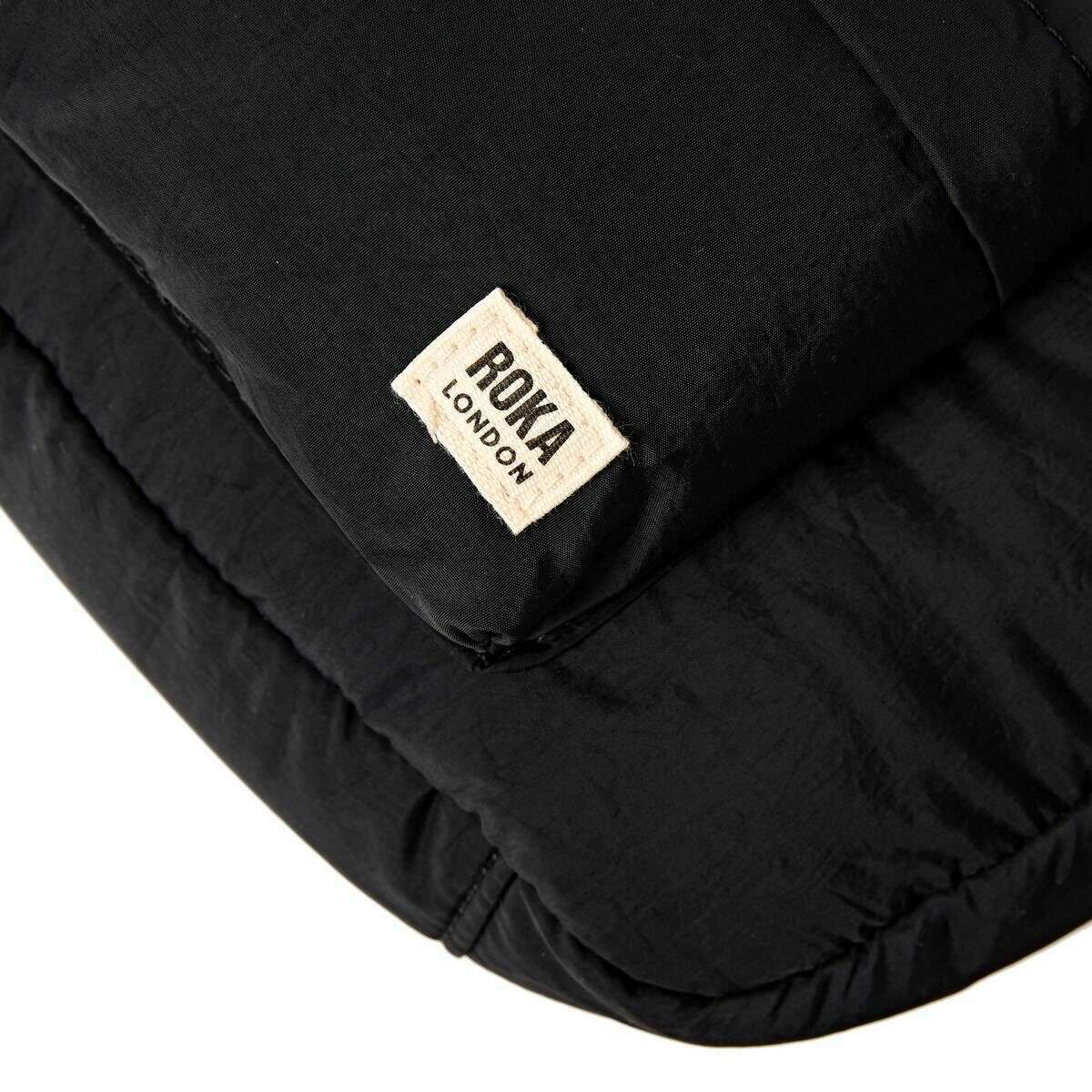 This unisex belsize recycled taslon small handbag by the brand Roka is made from 100% recycled nylon and is showcased in black. It measures 25cm(height) x 28cm(width) x 10cm(depth). All the bags come complete with roka packaging. The Roka Belsize Recycled Taslon Small Handbag - Black is a stylish and versatile puff taslon bag that combines functionality with a delightful design. With a strap that allows you to wear over the shoulder, this smaller bag features a spacious interior, nylon zipped pocket and extra compartments for all your essentials. There is an external puffed B-pocket for quick access to your most used items whilst on the move. Perfect for work, travel or weekend adventure, while giving off contemporary, eye-catching vibes.