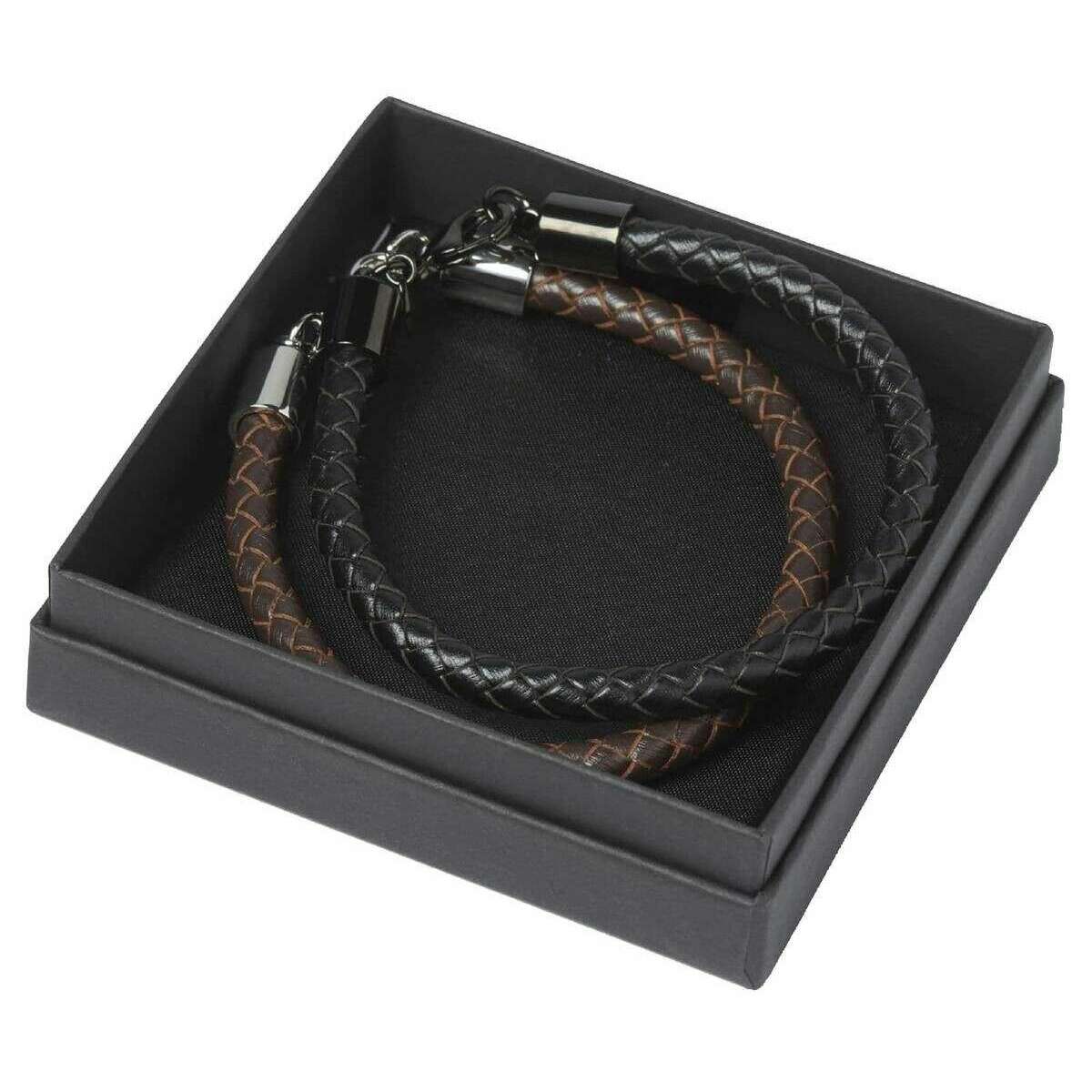 This men's bude bracelet set by the brand Simon Carter is made from stainless steel and leather and is showcased in black. All the bracelets come complete with simon carter packaging. The Simon Carter Bude Bracelet Set - Brown/Black/Silver is perfect for casual everyday wear. This bracelet set features two woven bracelets, one black and one brown. A lobster claw clasp ensures these bracelets are secure on your wrist!
