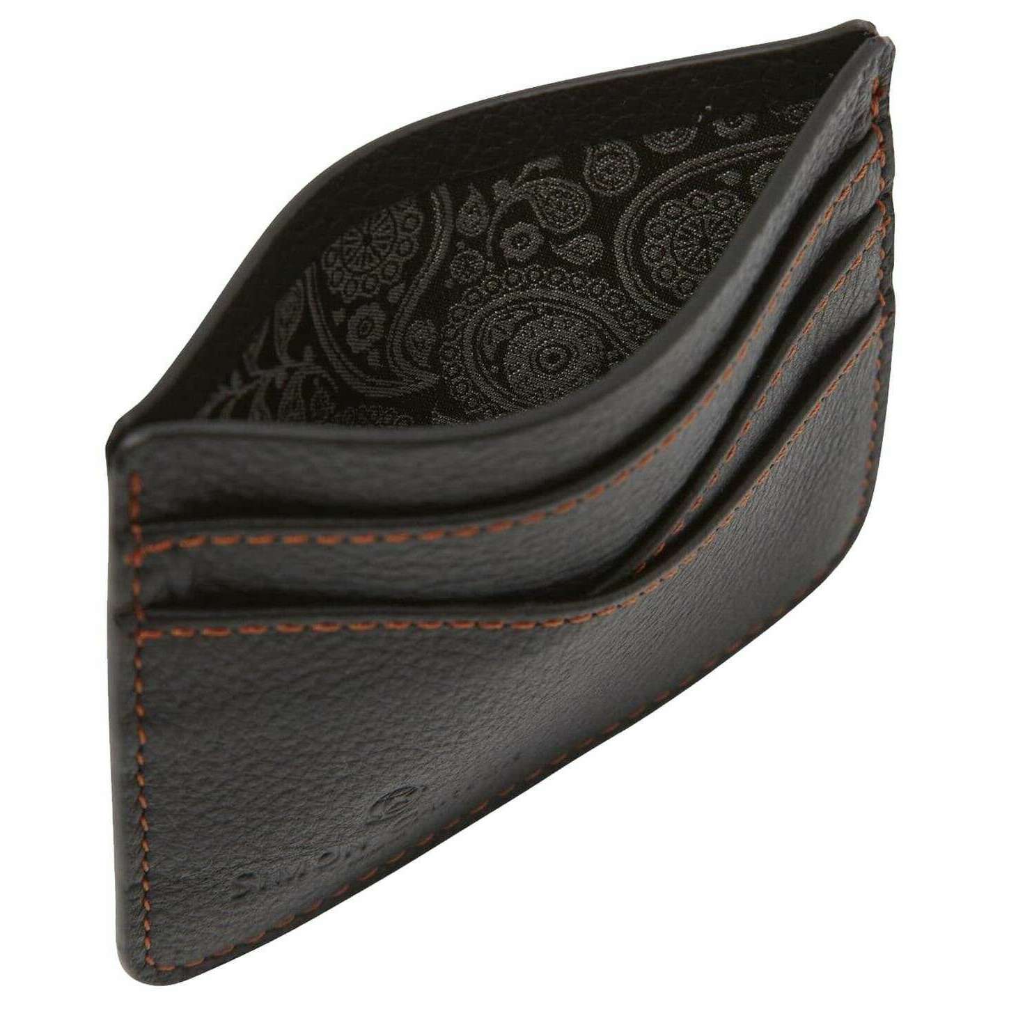 Manufactured from 100% leather is this black men's wave credit card holder by the designer Simon Carter. All the wallets come complete with simon carter packaging. The Simon Carter Wave Credit Card Holder - Black is perfect for everyday use! This black and brown wallet features a unique wave design, three card holders and paisley lining inside. This wallet makes for a perfect gift for any occasion!