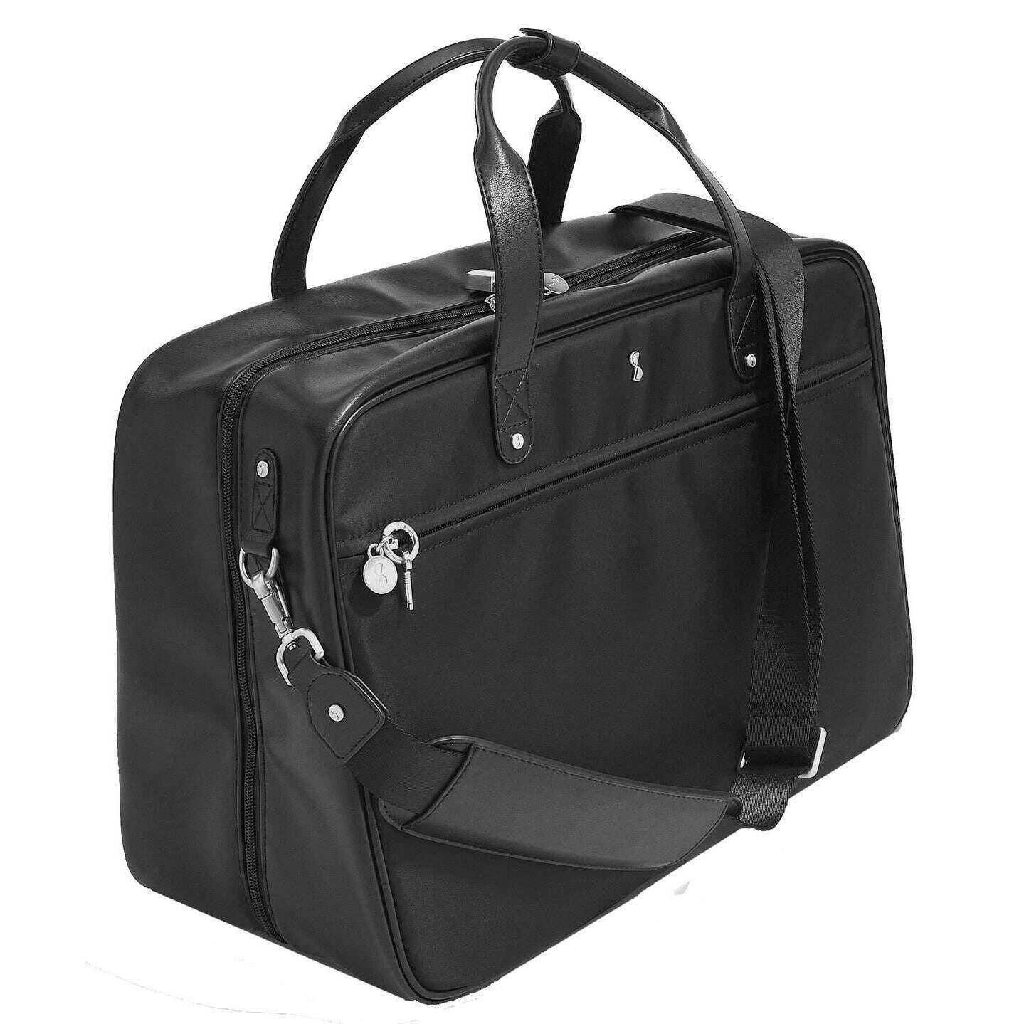 This well made women's cabin bag from Stackers comes in a black colour and is manufactured from faux leather and velvet. It measures 33.5cm(height) x 22.5cm(width) x 46cm(depth). All the bags come complete with stackers packaging. The Stackers Cabin Bag - Black is perfect for on the go use. This black cabin bags features a laptop pocket, two large zipped compartments and a range of smaller pockets. Complete with shoulder straps, backpack straps and a zip for added security.