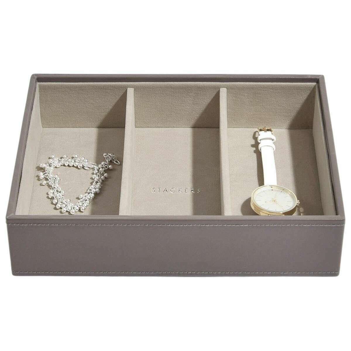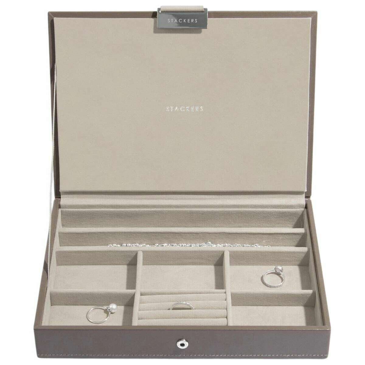 This well made women's classic jewellery box set of 4 from Stackers comes in a mink brown colour and is manufactured from faux leather and velvet. It measures 19.5cm(height) x 25cm(width) x 18cm(depth). It is recommended to wipe clean to keep this jewellery box in good condition. All the jewellery boxes come complete with stackers packaging. The Stackers Classic Jewellery Box set of 4 - Mink Brown is certain to impress with its unbelievable amount of space. Featuring a top lidded section for those precious little pieces, a middle 25 section tray for those charms or rings, another middle tray with three sections to hold your bracelets and necklaces with ring rolls to store more rings and earrings, and then the bottom is a deep three section box for those larger items like big bracelets, watches and sunglasses. Make this the most ideal jewellery box you can own with it offering so much in the most luxurious way.