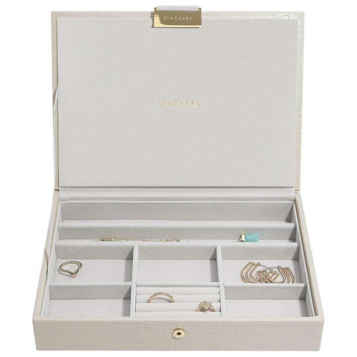 Brought to you by the brand Stackers, this putty grey women's classic jewellery box set of 4 is made from faux leather and velvet. It measures 19.5cm(height) x 25cm(width) x 18cm(depth). It is recommended to wipe clean to keep this jewellery box in good condition. All the jewellery boxes come complete with stackers packaging. The Stackers Classic Jewellery Box set of 4 - Putty Grey is certain to impress with its unbelievable amount of space. Featuring a top lidded section for those precious little pieces, a middle 25 section tray for those charms or rings, another middle tray with three sections to hold your bracelets and necklaces with ring rolls to store more rings and earrings, and then the bottom is a deep three section box for those larger items like big bracelets, watches and sunglasses. Make this the most ideal jewellery box you can own with it offering so much in the most luxurious way.