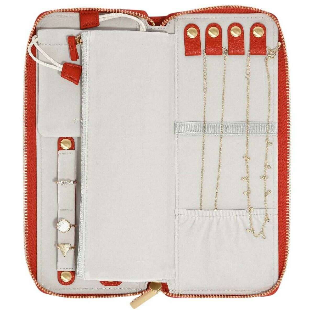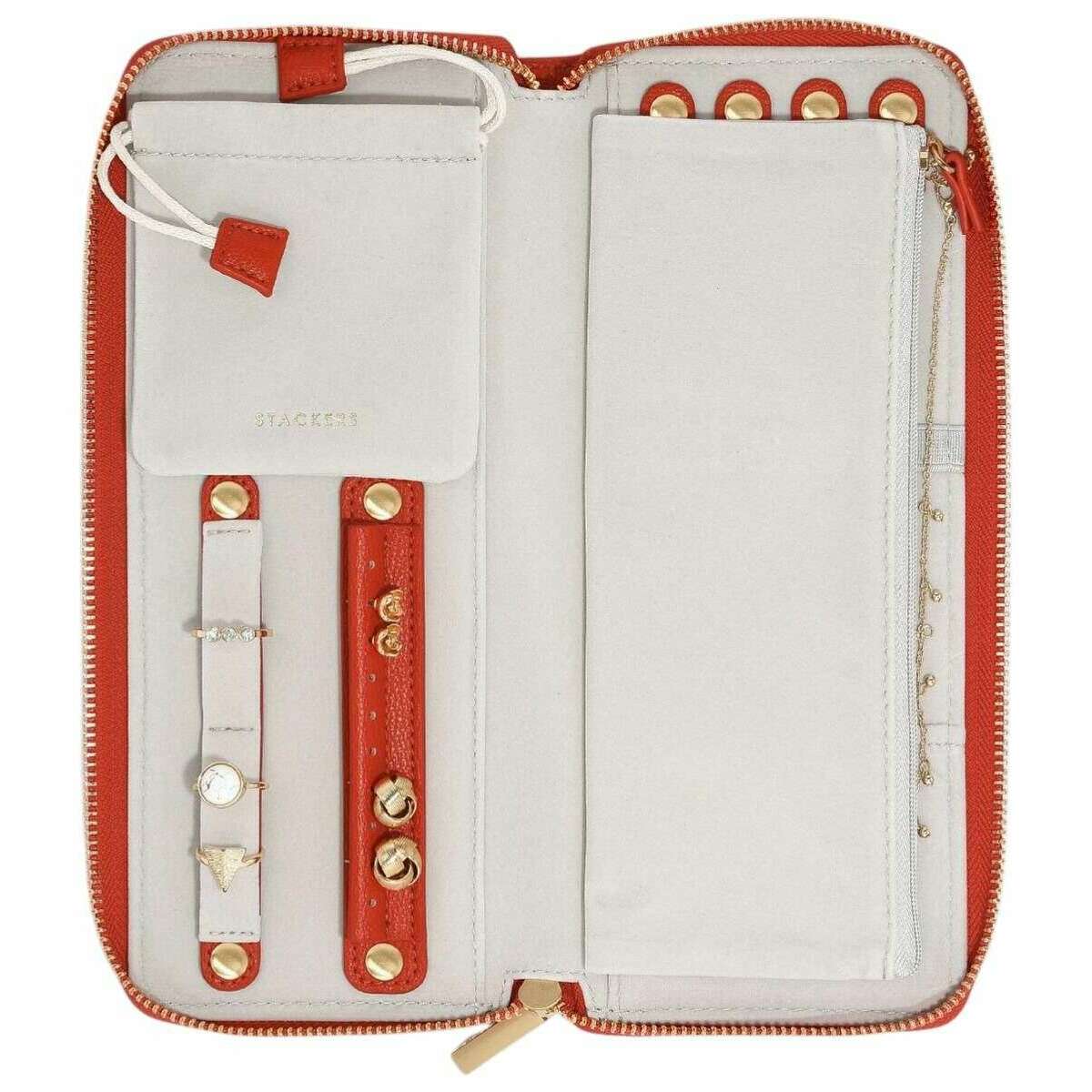 Introducing this women's classic medium jewellery roll by Stackers, it is manufactured from faux leather and velvet in a red colour. It measures 3cm(height) x 24.5cm(width) x 10.5cm(depth). It is recommended to wipe clean to keep this jewellery box in good condition. All the jewellery boxes come complete with stackers packaging. The Stackers Classic Medium Jewellery Roll - Red features a variety of parts that will allow you to organise your jewellery anytime, anywhere. All secure with its zipped closure you can be sure that your favourite pieces of jewellery are kept safe inside at all times. This roll has space for up to four necklaces or bracelets, has an earring holder, and a small velvet pouch to keep small and loose items safe. A special part of this accessory case is that you can store favourite necklaces and bracelets without the hassle of tangling. This is the perfect jewellery organiser to have when travelling or just keeping your home neat and tidy.