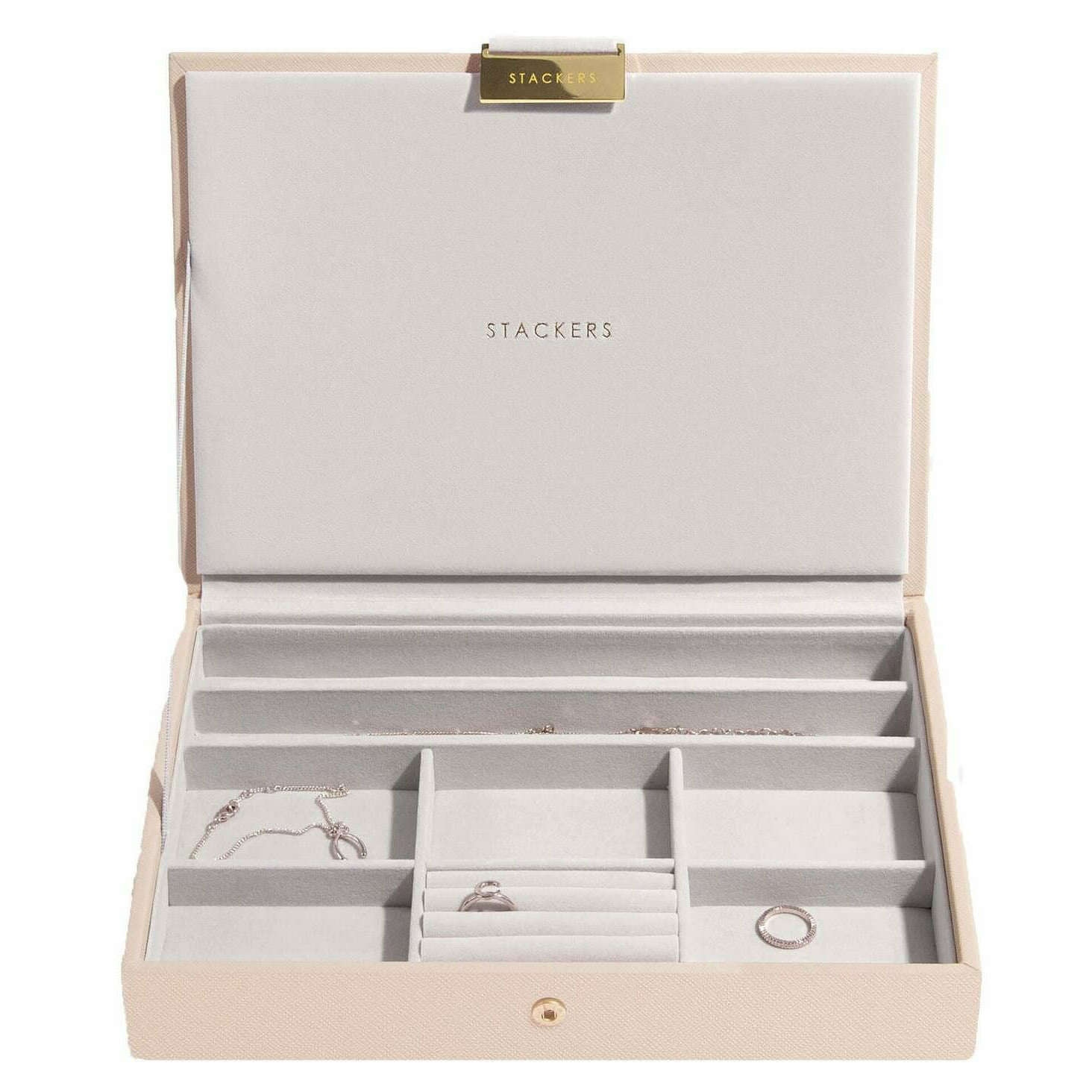 This women's classic set of 4 jewellery box by the brand Stackers is made from faux leather and velvet and is showcased in pink. It measures 19.5cm(height) x 25cm(width) x 18cm(depth). All the jewellery boxes come complete with stackers packaging. The Stackers Classic Set of 4 Jewellery Box - Blush Pink Woven features a unique pink woven jewellery box design. This jewellery box is perfect for storing all your jewellery items! Comes complete with four layers and multiple sized sections for earrings, rings and bracelets and a larger section for watches and bangles.