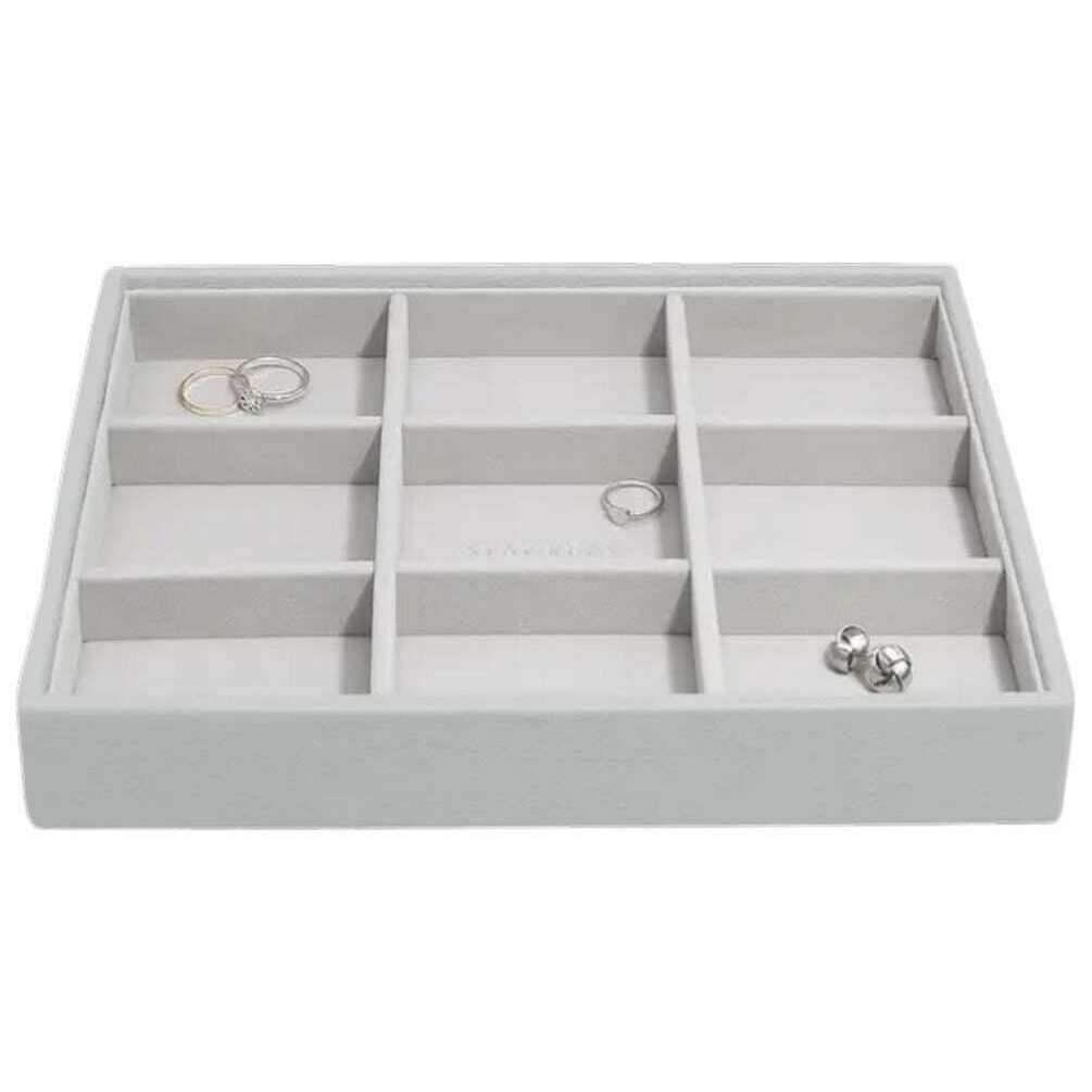 This women's classic statement layer has been made from faux leather and velvet, featured in a grey colour and is from the brand Stackers. It measures 3.7cm(height) x 25cm(width) x 18cm(depth). It is recommended to wipe clean to keep this jewellery box in good condition. All the jewellery boxes come complete with stackers packaging. The Stackers Classic Statement Layer - Pebble Grey has been cleverly created and designed to hold all of your earrings, rings or hair clips perfectly. It can be added to any other classic jewellery tray to create a jewellery box or it can be used on its own. You won't have to compromise on organisation.