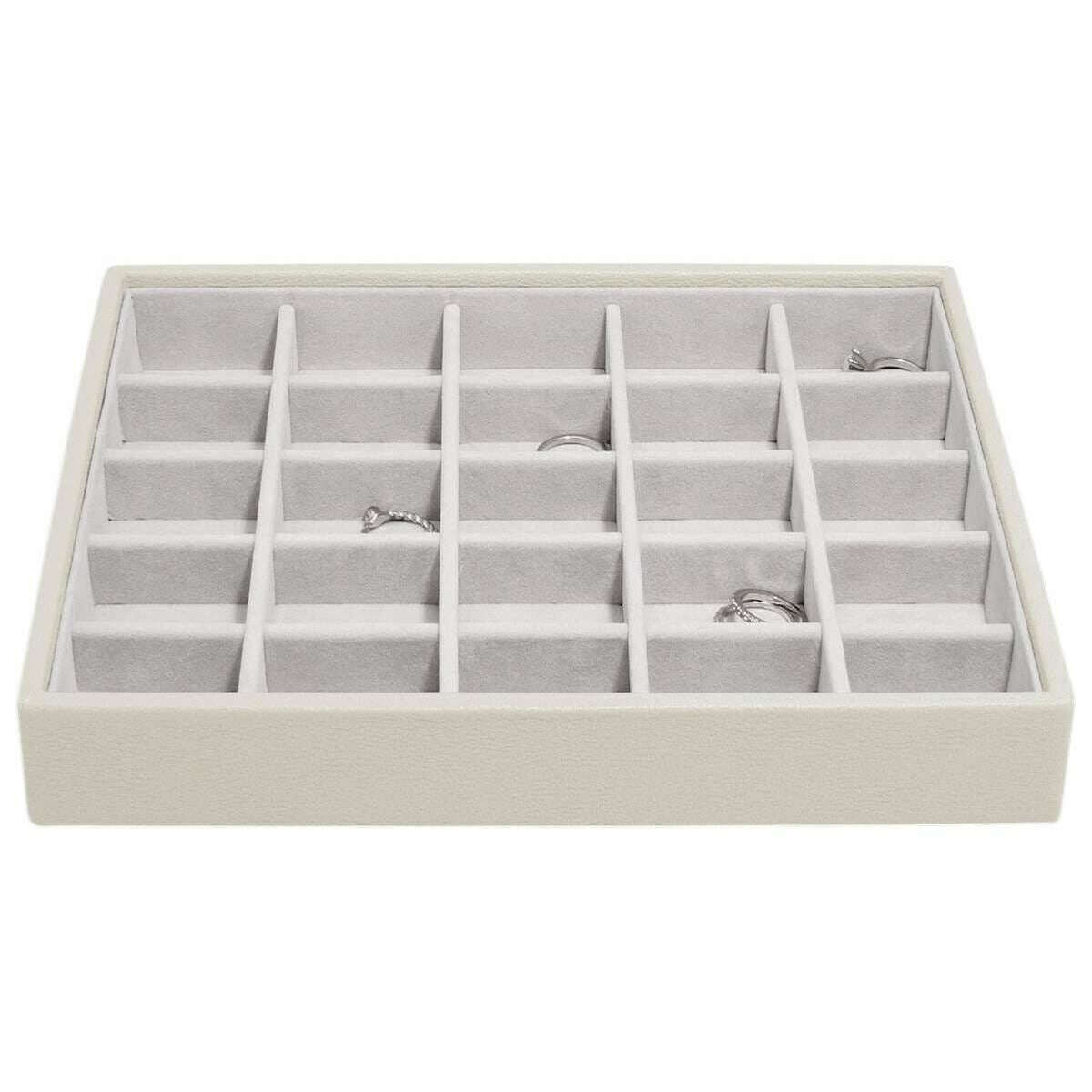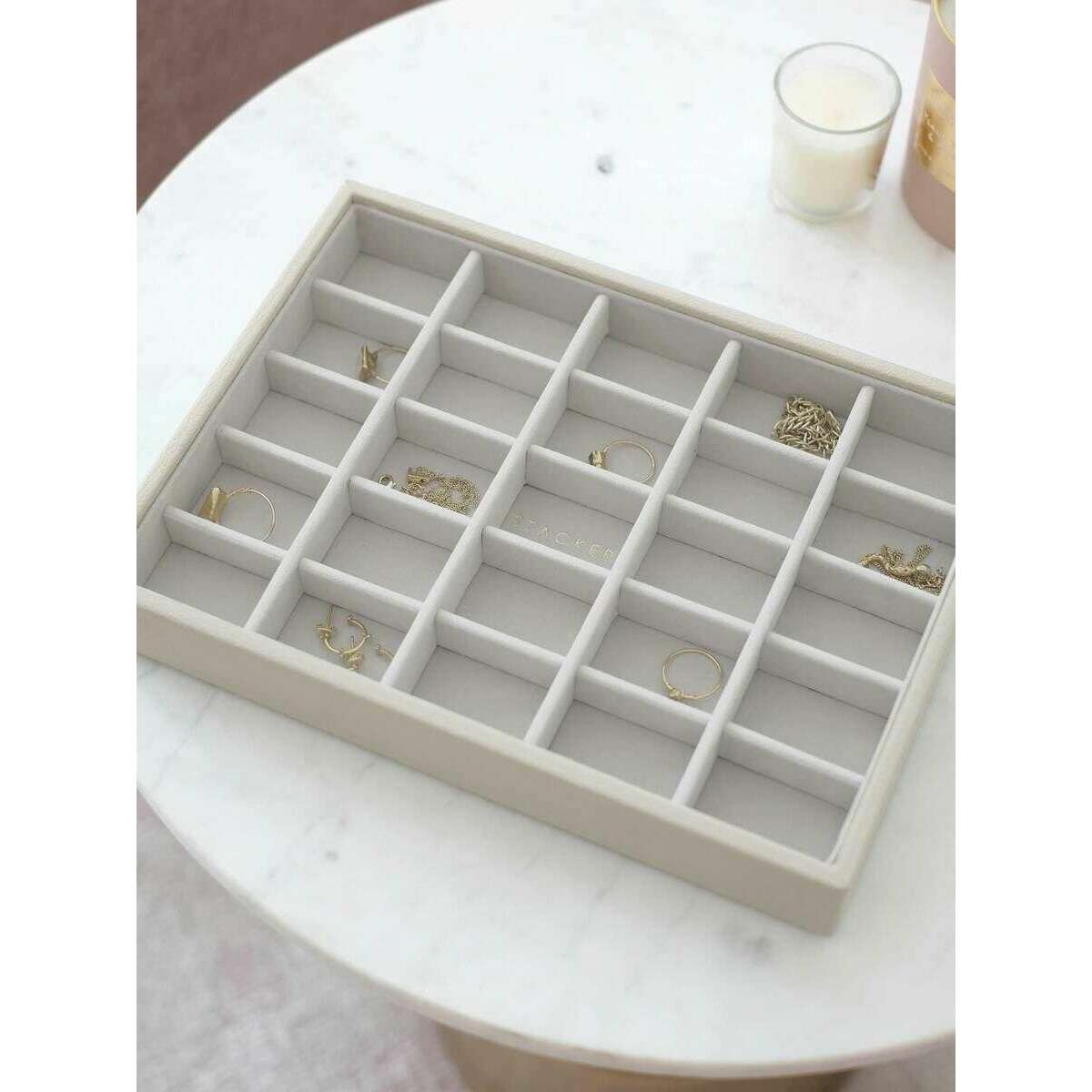 Manufactured from faux leather and velvet is this oatmeal women's classic trinket layer by the designer Stackers. It measures 3.7cm(height) x 25cm(width) x 18cm(depth). It is recommended to wipe clean to keep this jewellery box in good condition. All the jewellery boxes come complete with stackers packaging. The Stackers Classic Trinket Layer - Oatmeal is a great layer for smaller jewellery such as rings, earrings or charms. Offering 25 equal compartments, it is a simple, yet practical organiser for your loose jewellery so they can be stored safely in one place for when you need to grab them. The luscious velvet lining is soft against your accessory, keeping them in immaculate condition. This piece can pair with other Stackers pieces to create a tailored jewellery box to fit your needs.