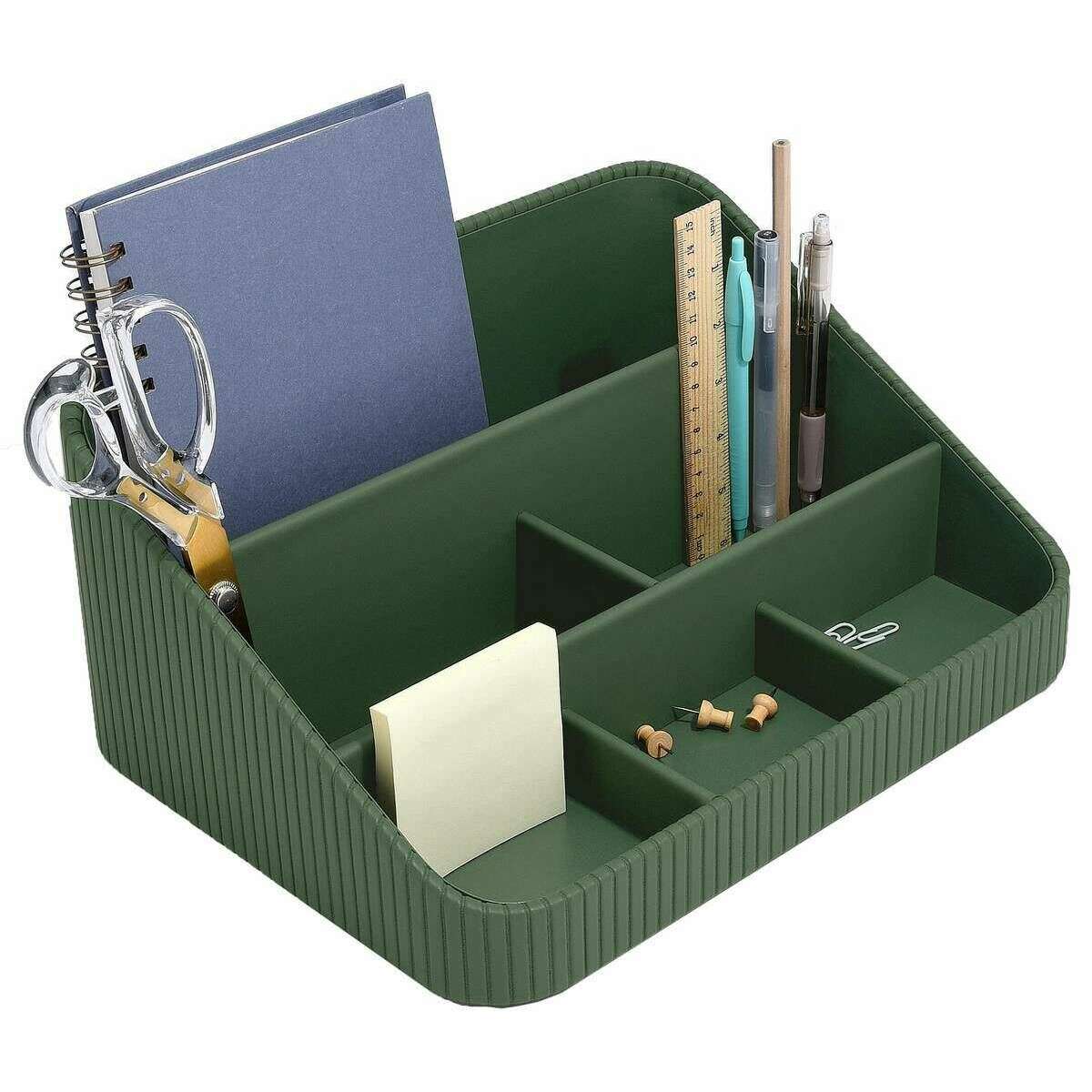 This well made women's desk organiser from Stackers comes in a emerald green colour and is manufactured from faux leather. It measures 14.5cm(height) x 24.5cm(width) x 32.5cm(depth). All the desk accessories come complete with stackers packaging. The Stackers Desk Organiser - Emerald Green features a beautiful green design. This desk organiser has many sections for stationary, notebooks and many more trinkets, all within easy reach!