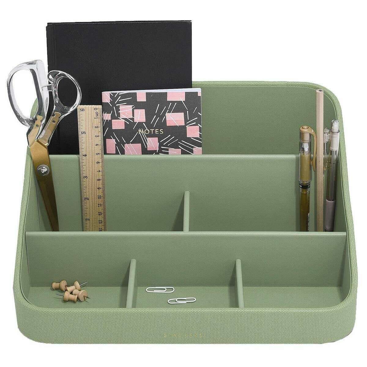 Designer Stackers has brought you this women's faux leather desk accessory using pistachio green tones. It measures 14.5cm(height) x 24.5cm(width) x 32.5cm(depth). All the desk accessories come complete with stackers packaging. The Stackers Desk Organiser - Pistachio Green features a beautiful green design. This desk organiser has many sections for stationary, notebooks and many more trinkets, all within easy reach!